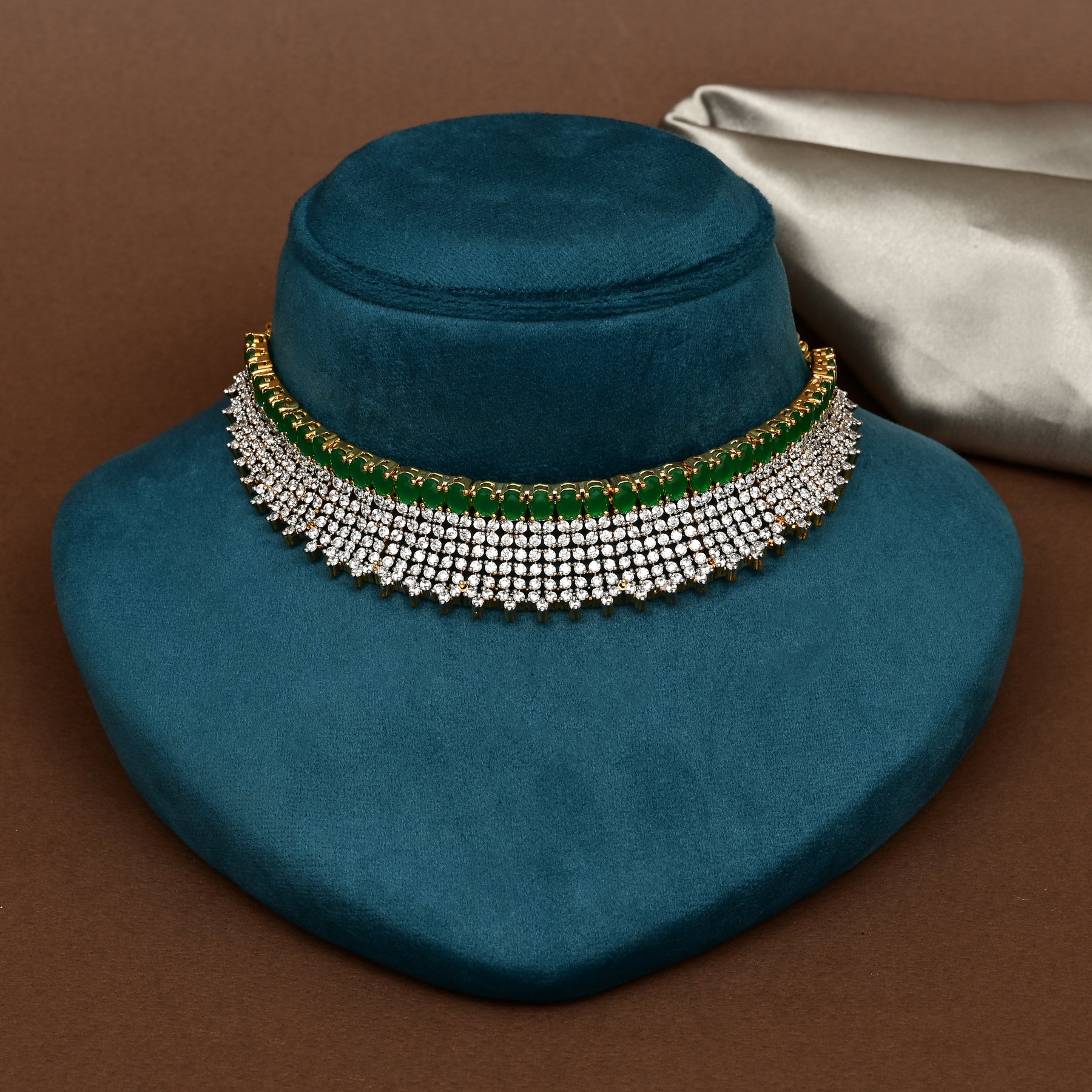 This elegant CZ Emerald Choker features real CZ stones and semi precious Emerald stones. Hand crafted with diamond-like precision, this choker boasts a simple yet sophisticated design. Perfect for adding a touch of glamour to any outfit.
