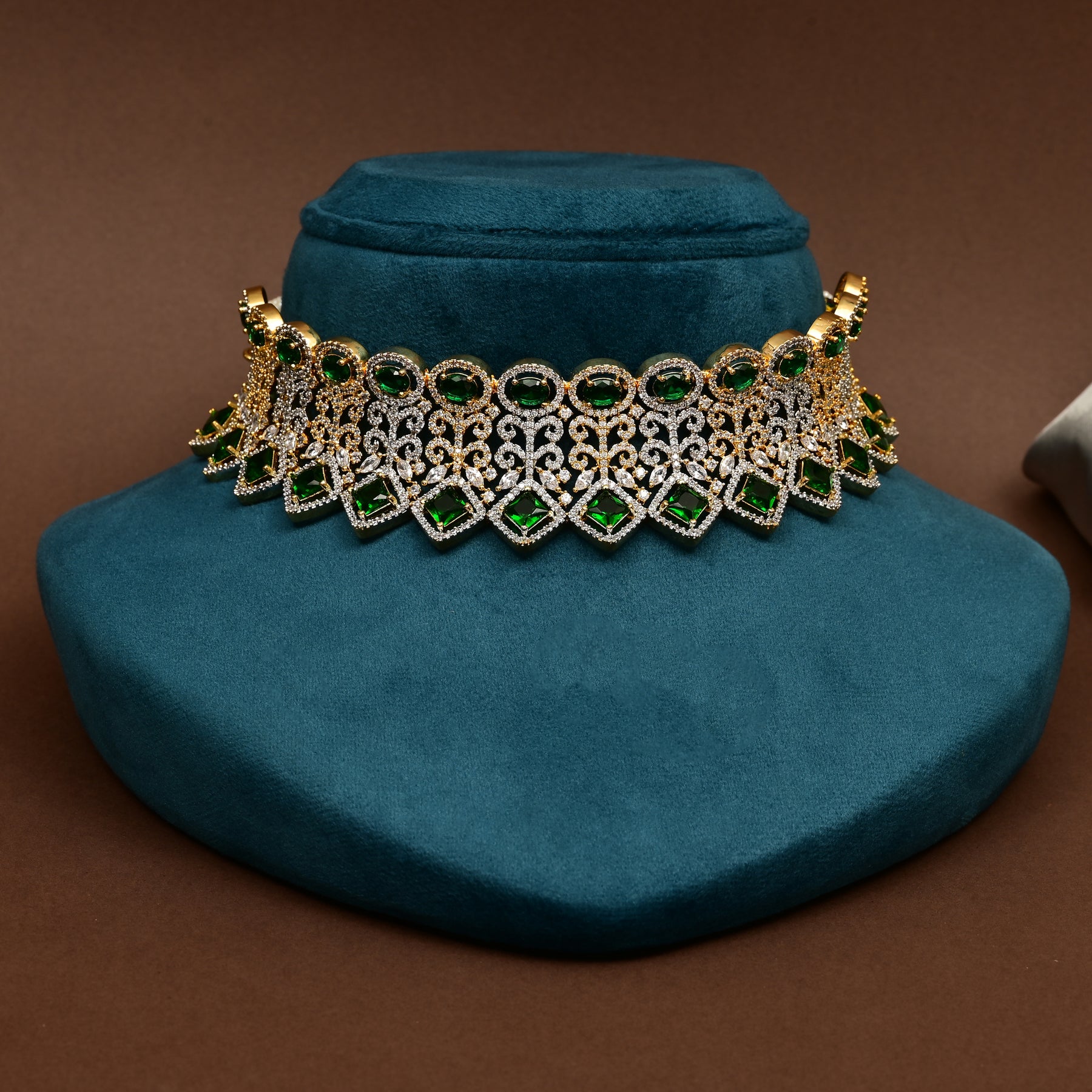 Introducing our CZ Emerald Choker, featuring real CZ stones and semi precious Emerald stones. Each piece is handcrafted to create a diamond-like sparkle, making it truly one-of-a-kind. Elevate any outfit with this exclusive design. Expertly crafted for the sophisticated and discerning jewelry lover.