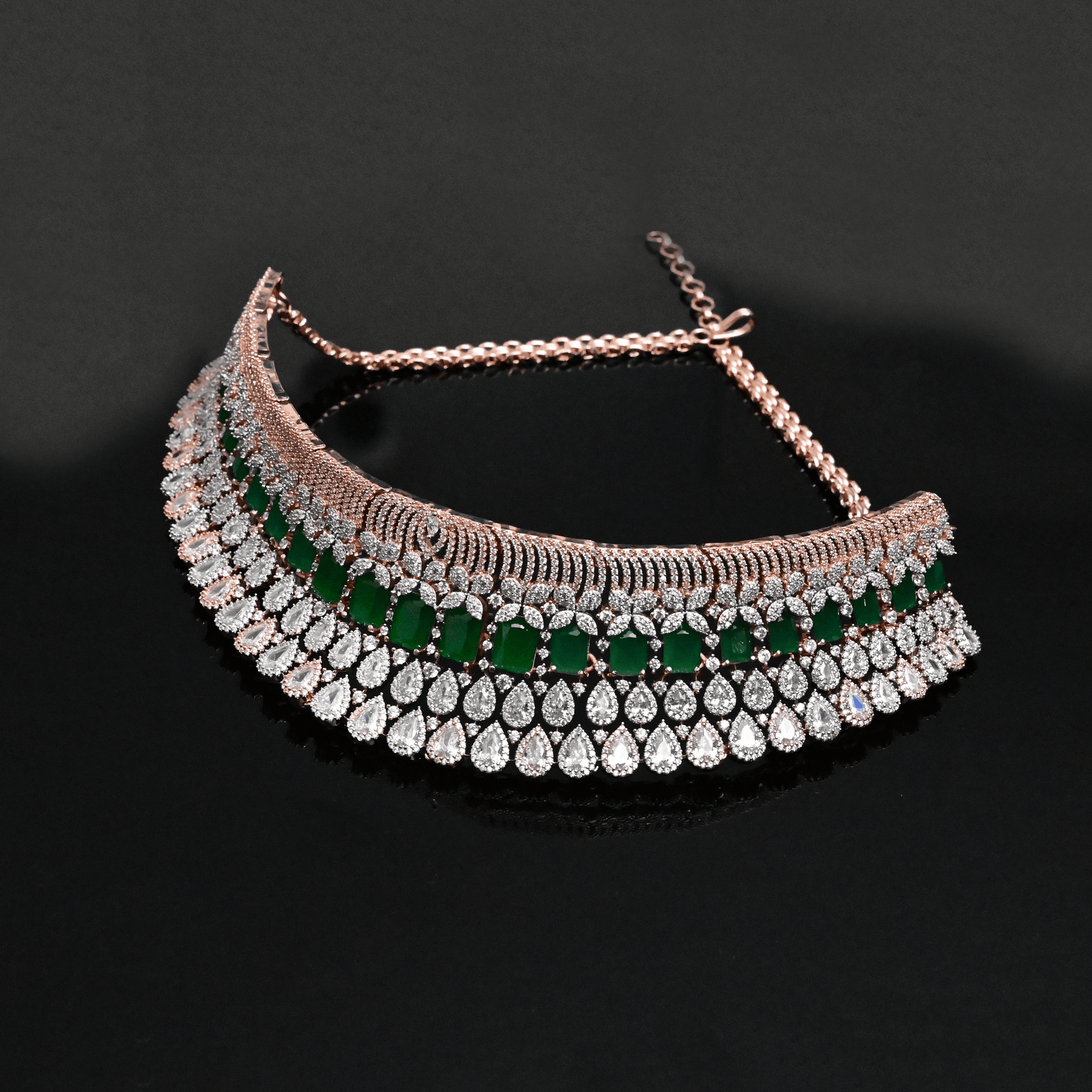 Expertly crafted with real CZ stones, this CZ Emerald Choker exudes elegance and luxury. The addition of semi-precious Emerald stones creates a unique and exclusive design, making it a one-of-a-kind piece. With its hand-crafted diamond-like appearance, this choker is sure to make a statement at any event.