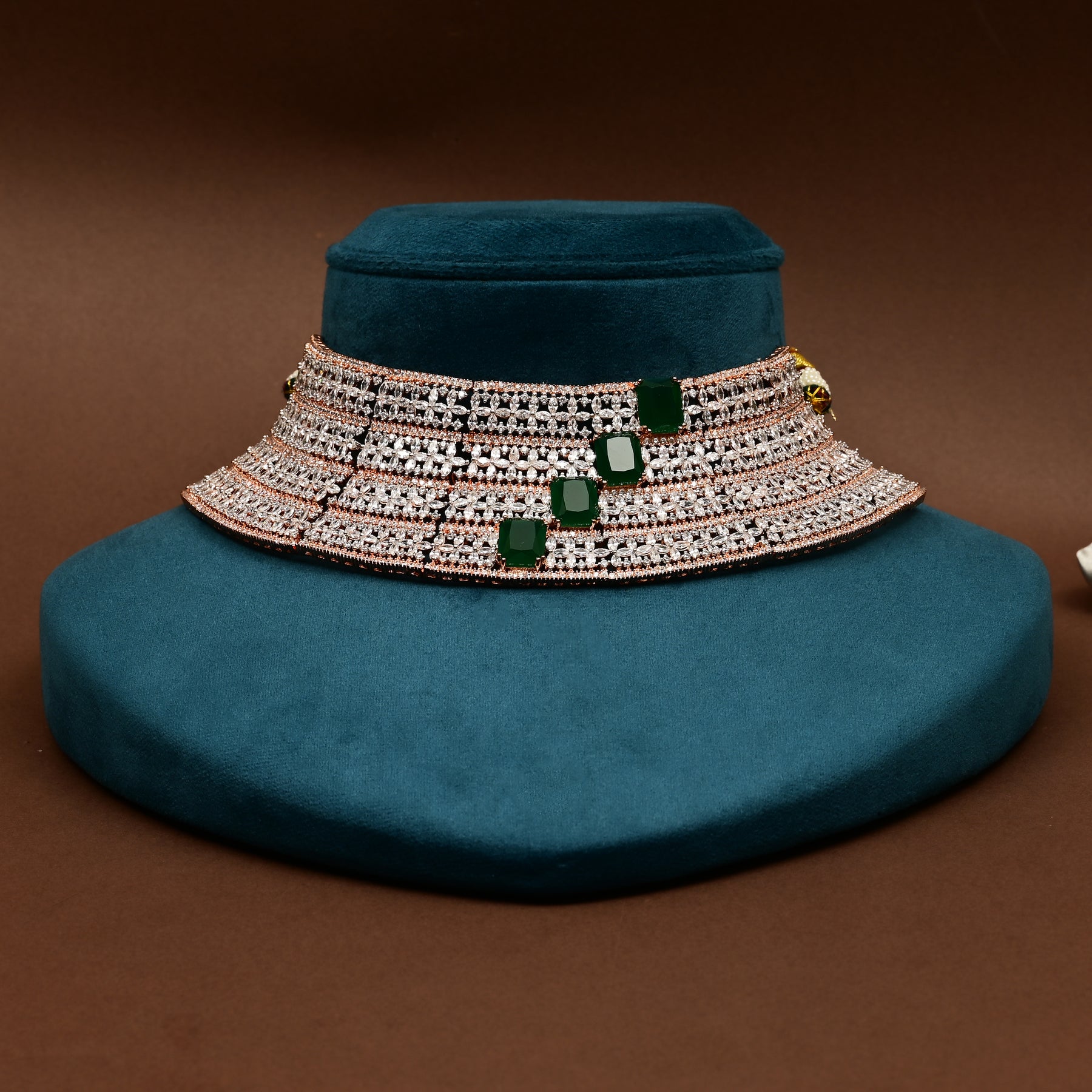 The CZ Emerald Choker is a one of a kind, hand-crafted piece featuring real CZ stones and semi-precious Emerald stones. Its unique, exclusive design exudes luxury and elegance. Experience the brilliance of diamond-like stones without the high cost.