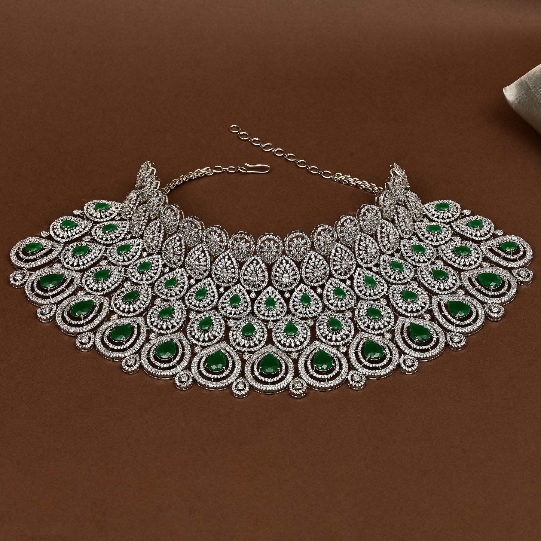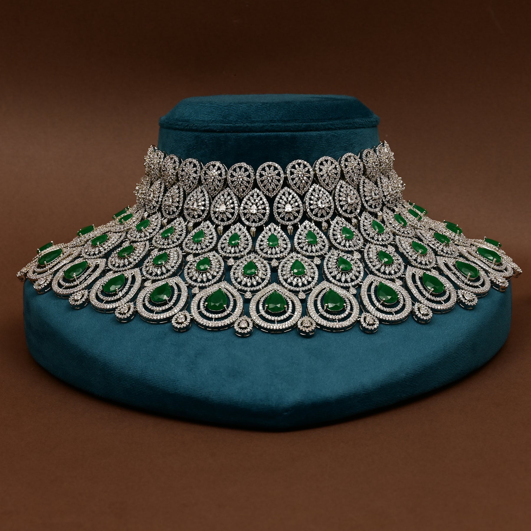 This hand-crafted CZ Emerald Choker features real CZ stones and semi-precious Emerald stones, creating a one-of-a-kind exclusive design. With its diamond-like appearance, this choker adds a touch of luxury and elegance to any outfit. Elevate your style with this unique and expertly crafted piece.