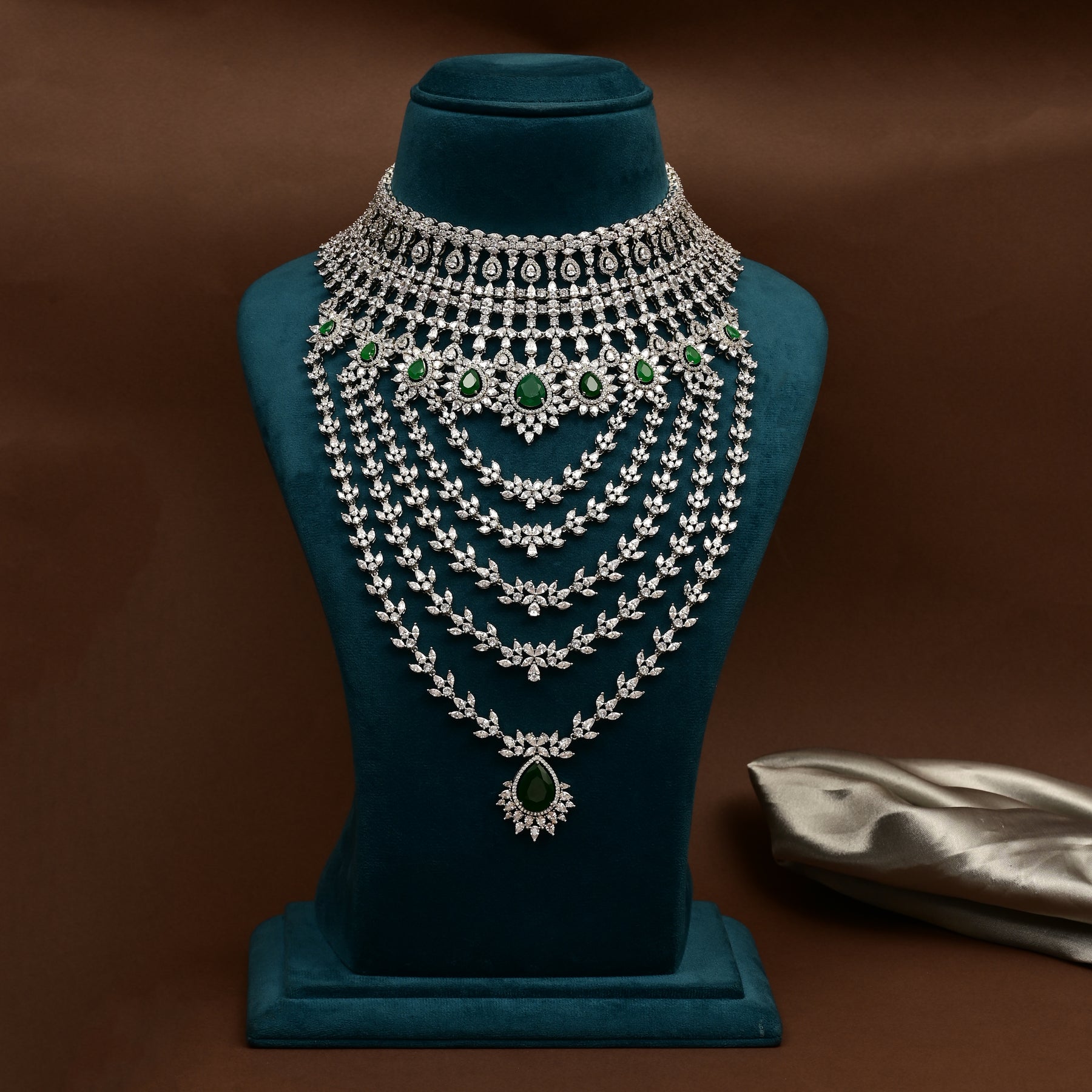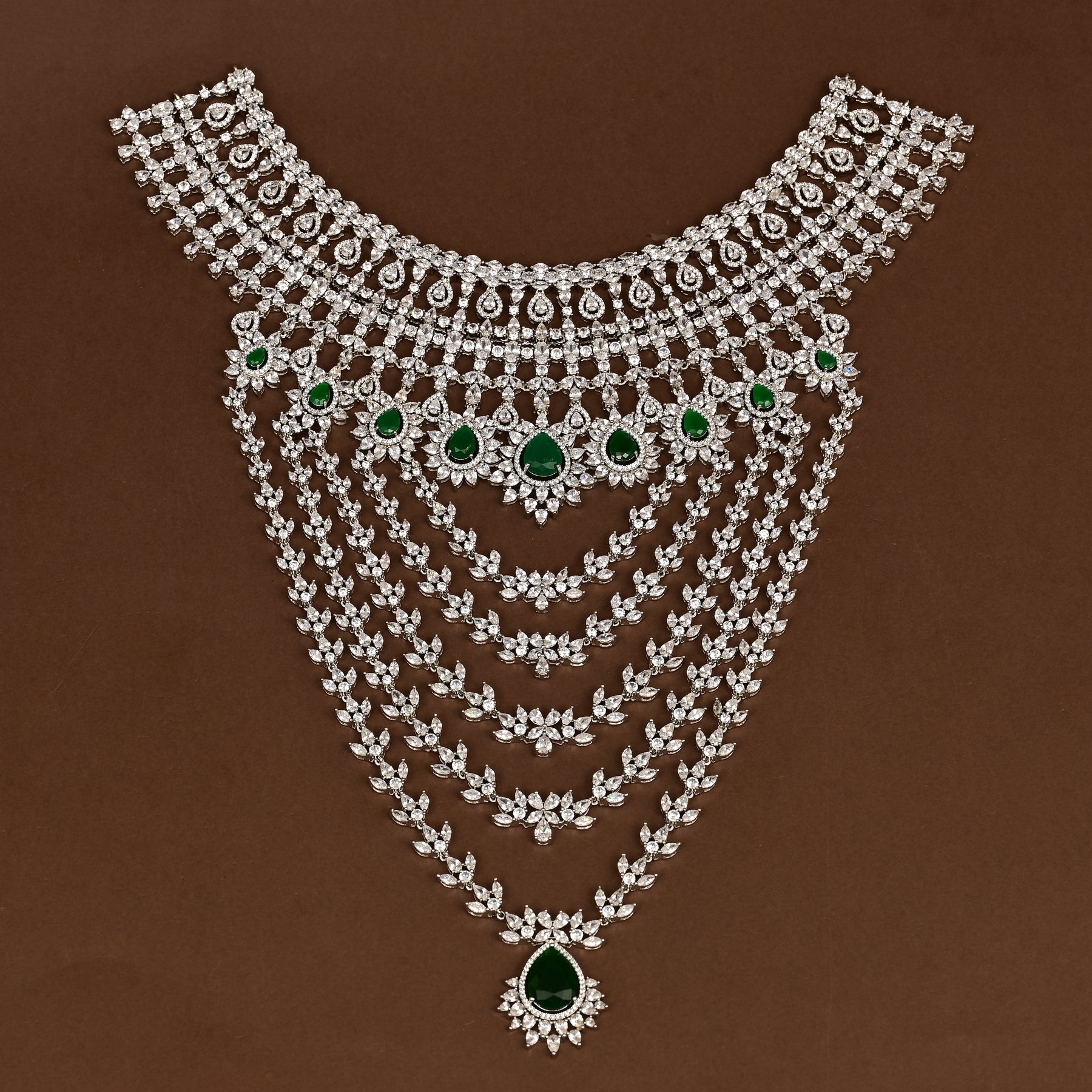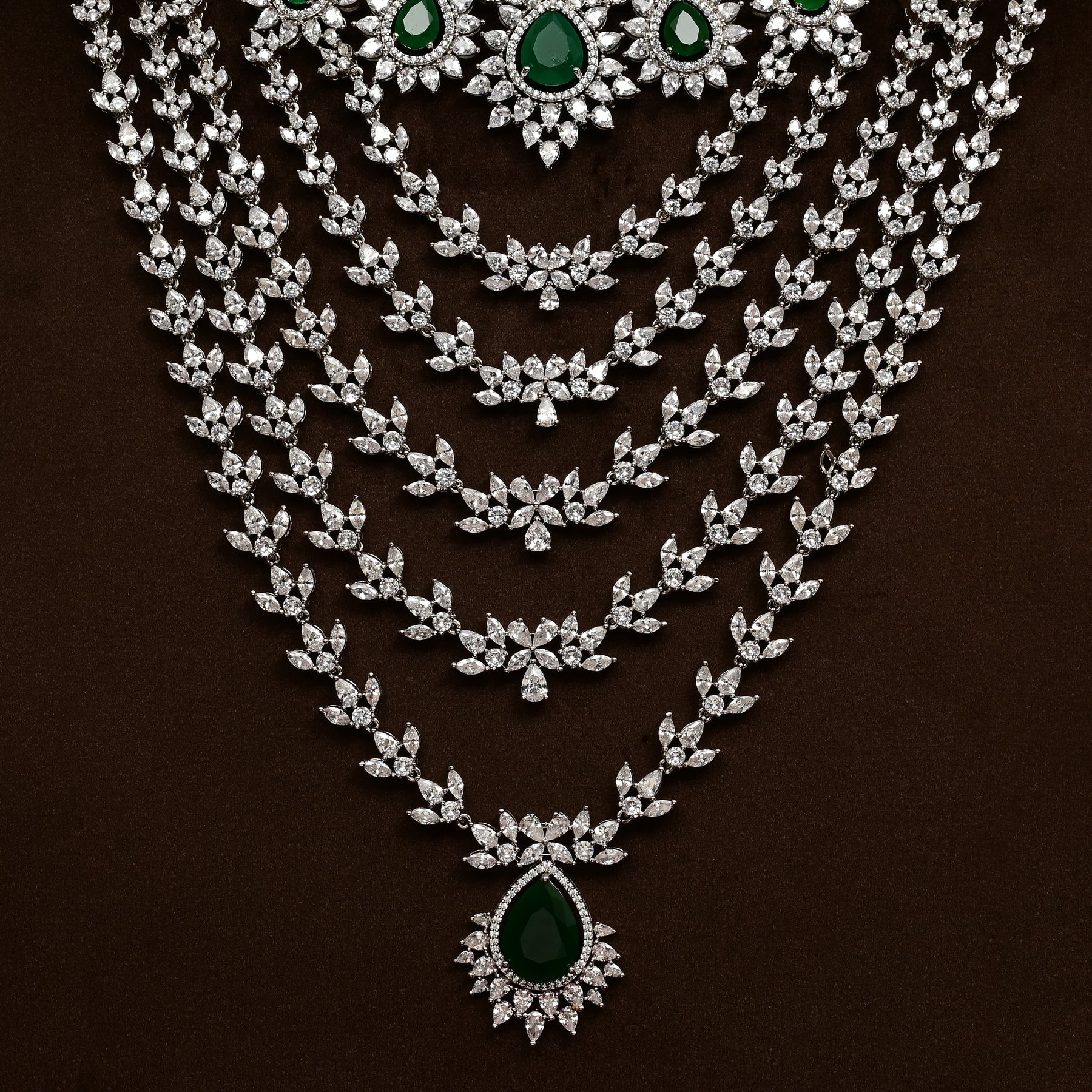 This CZ Emerald Choker is a stunning, one-of-a-kind bridal choker featuring hand-crafted, diamond-like CZ stones and semi-precious Emerald stones. Its exclusive design adds a touch of elegance and sophistication to any occasion. Get the look of real CZ stones without the high price tag.