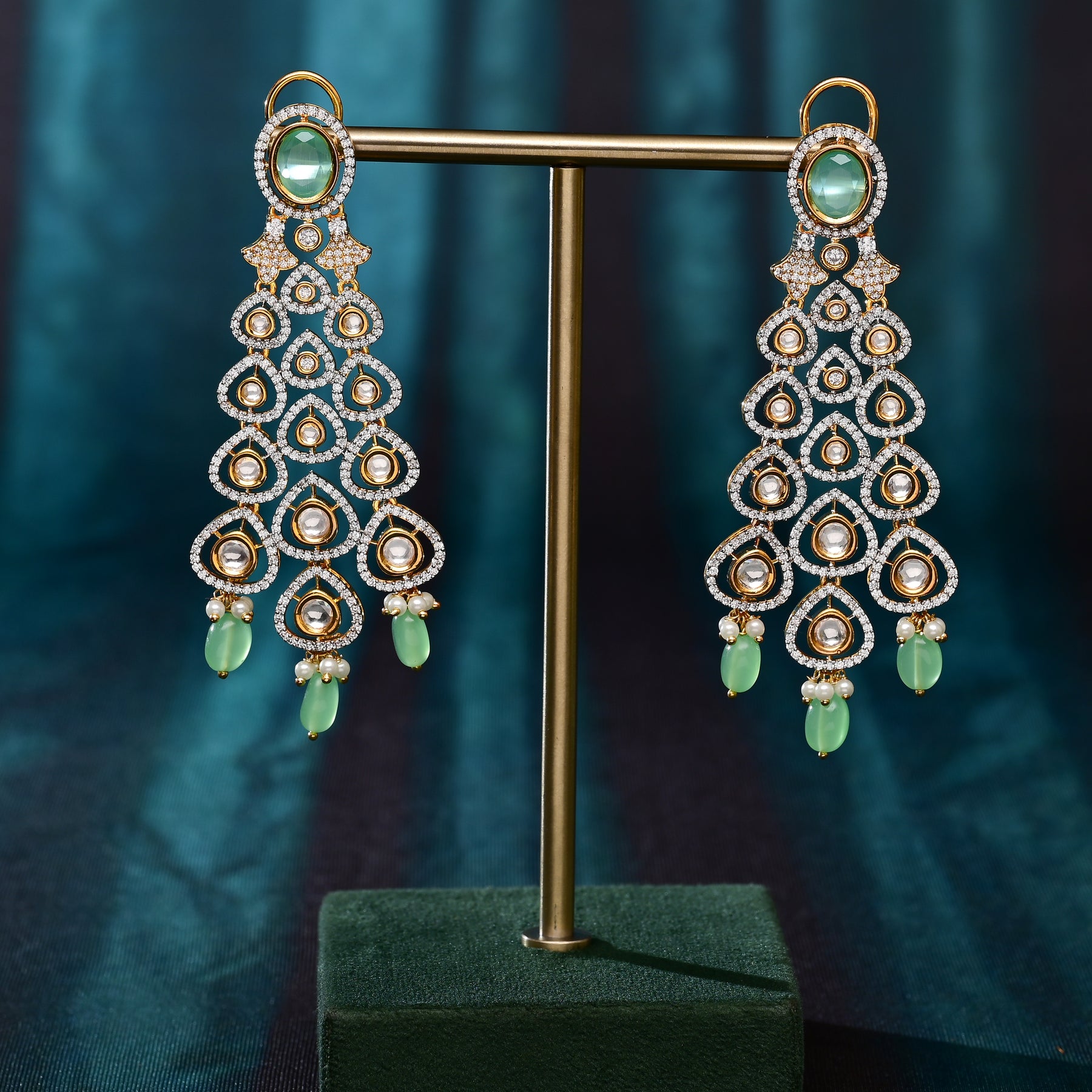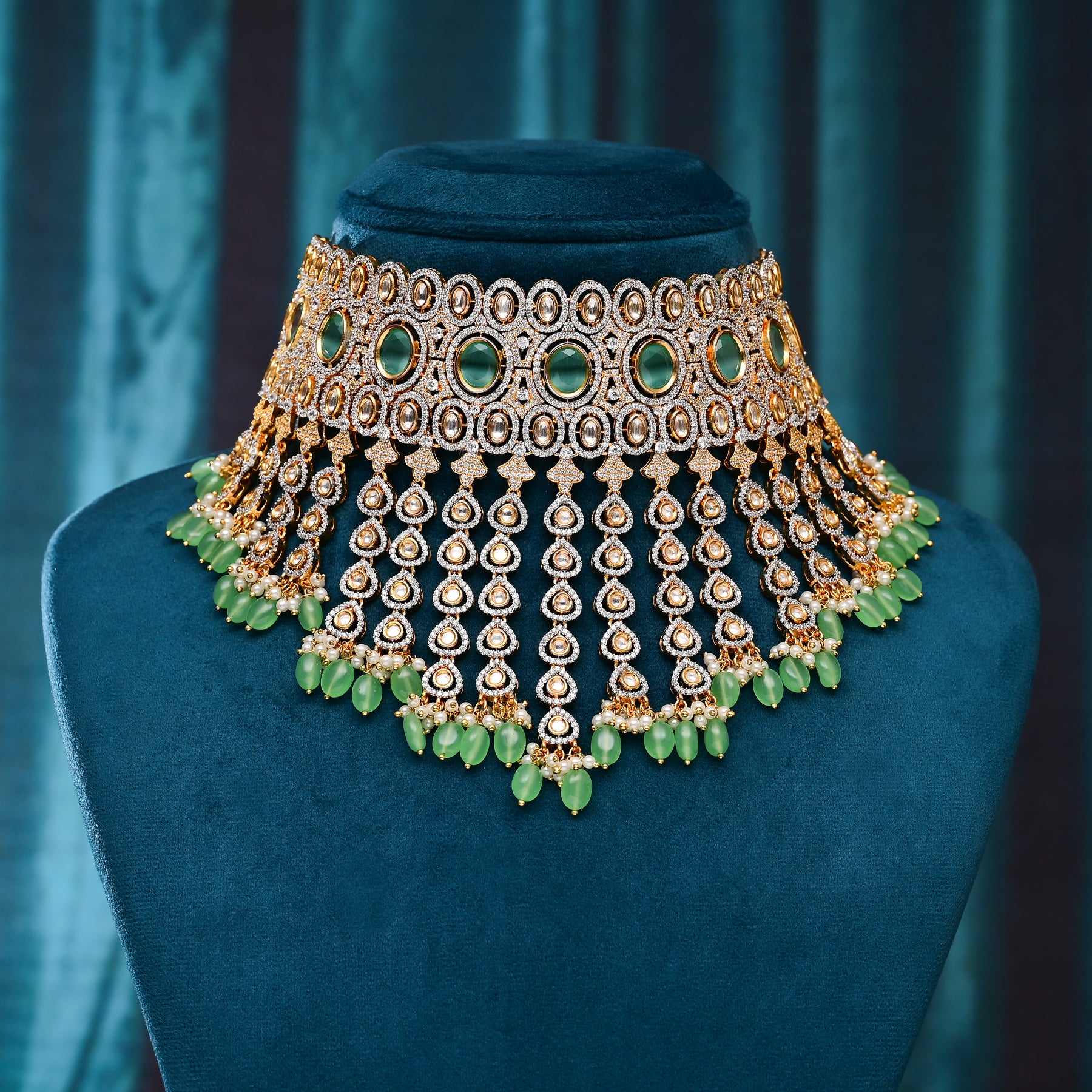 Expertly crafted, this CZ Polki choker sparkles with real CZ stones and semi-precious polki diamonds. Designed with precision and beauty, this choker is a must-have for any jewelry lover. Elevate your look with this hand-crafted piece that radiates elegance and sophistication.