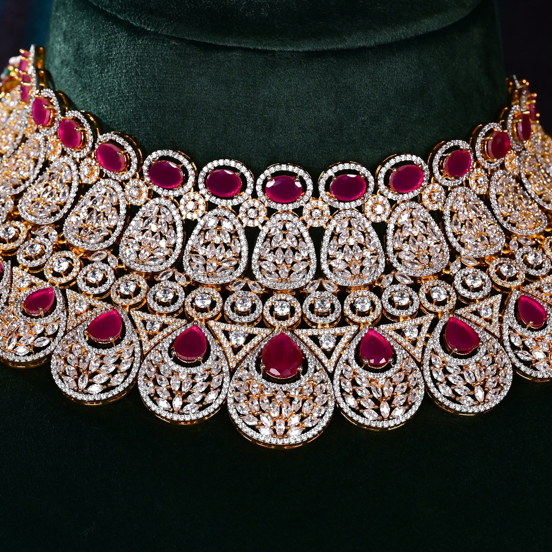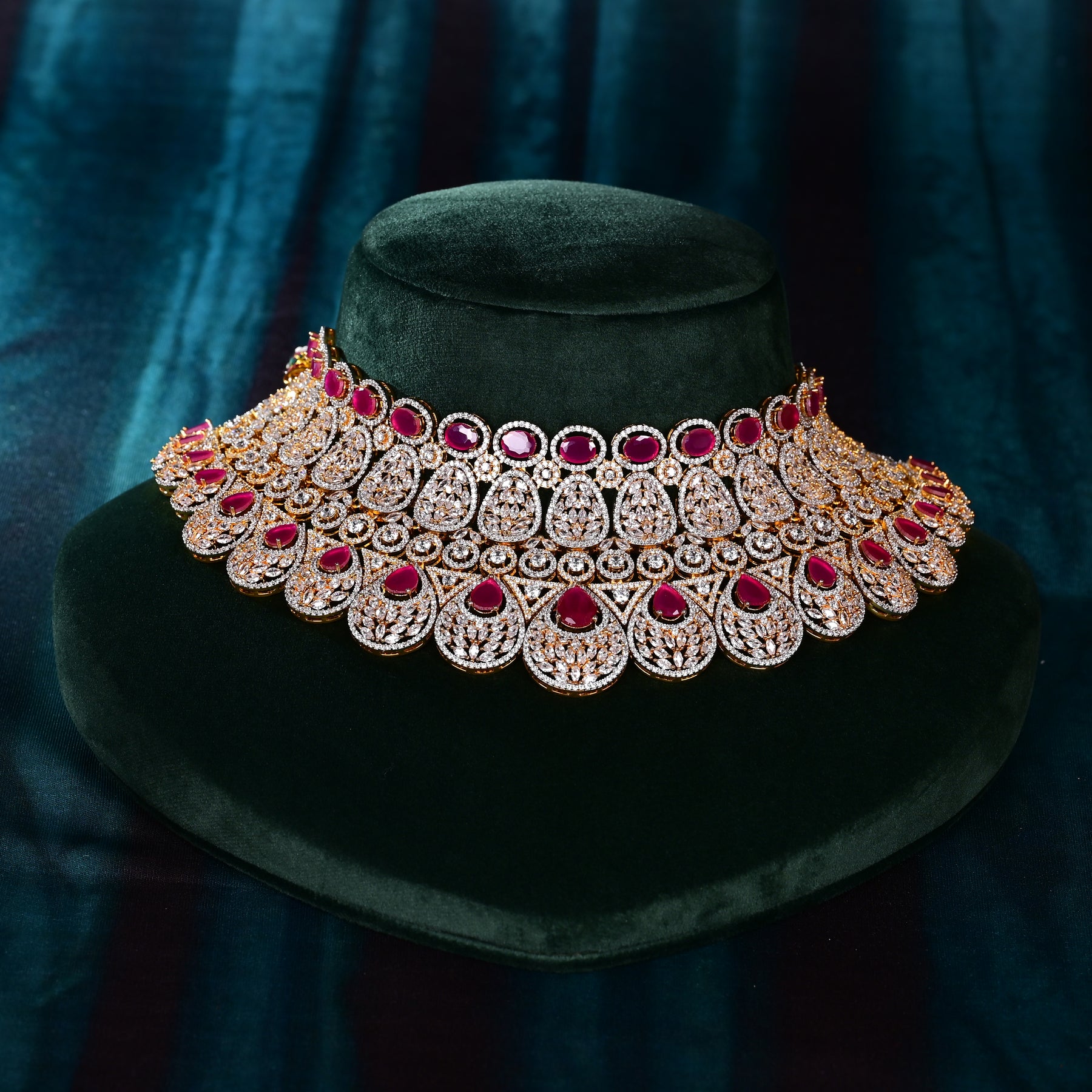Crafted with expertise and attention to detail, our CZ Ruby Choker features a stunning semi precious ruby stone and sparkling diamonds. This handmade piece showcases intricate design and adds a touch of elegance to any outfit. Elevate your style with this beautiful choker.