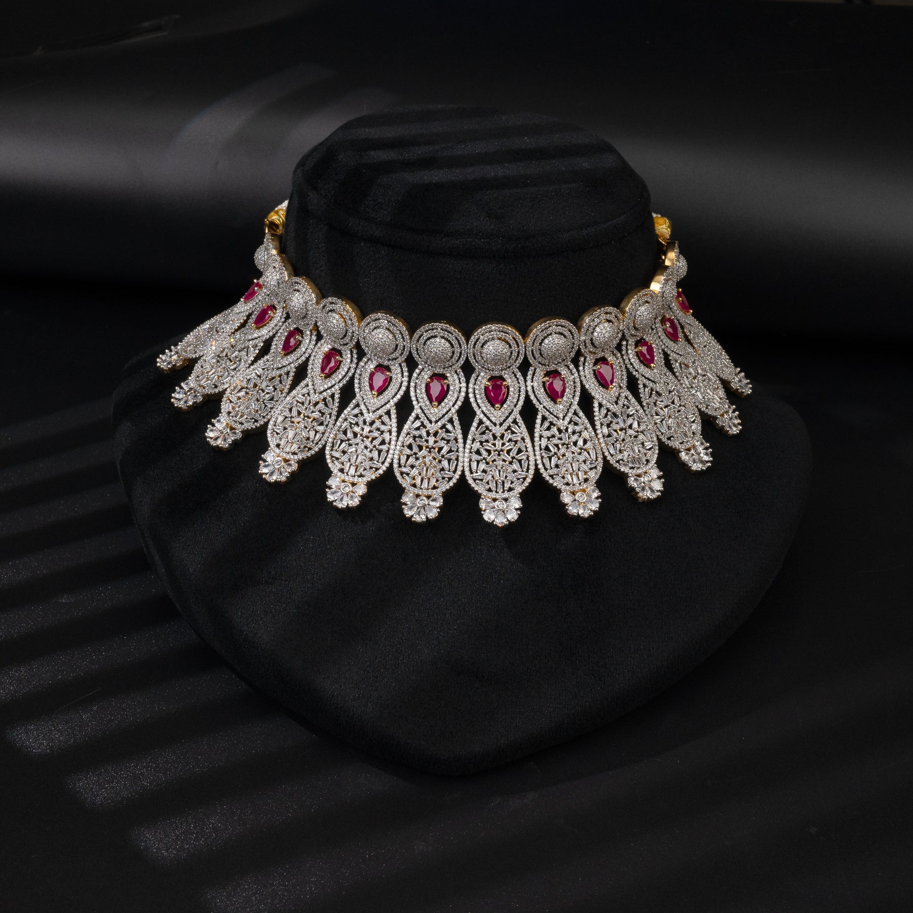 The CZ Ruby Choker is a must-have for any jewelry collection. With real CZ and semi-precious ruby stones, its hand-crafted diamond-like design exudes luxury and exclusivity. Don't miss out on this one-of-a-kind piece.