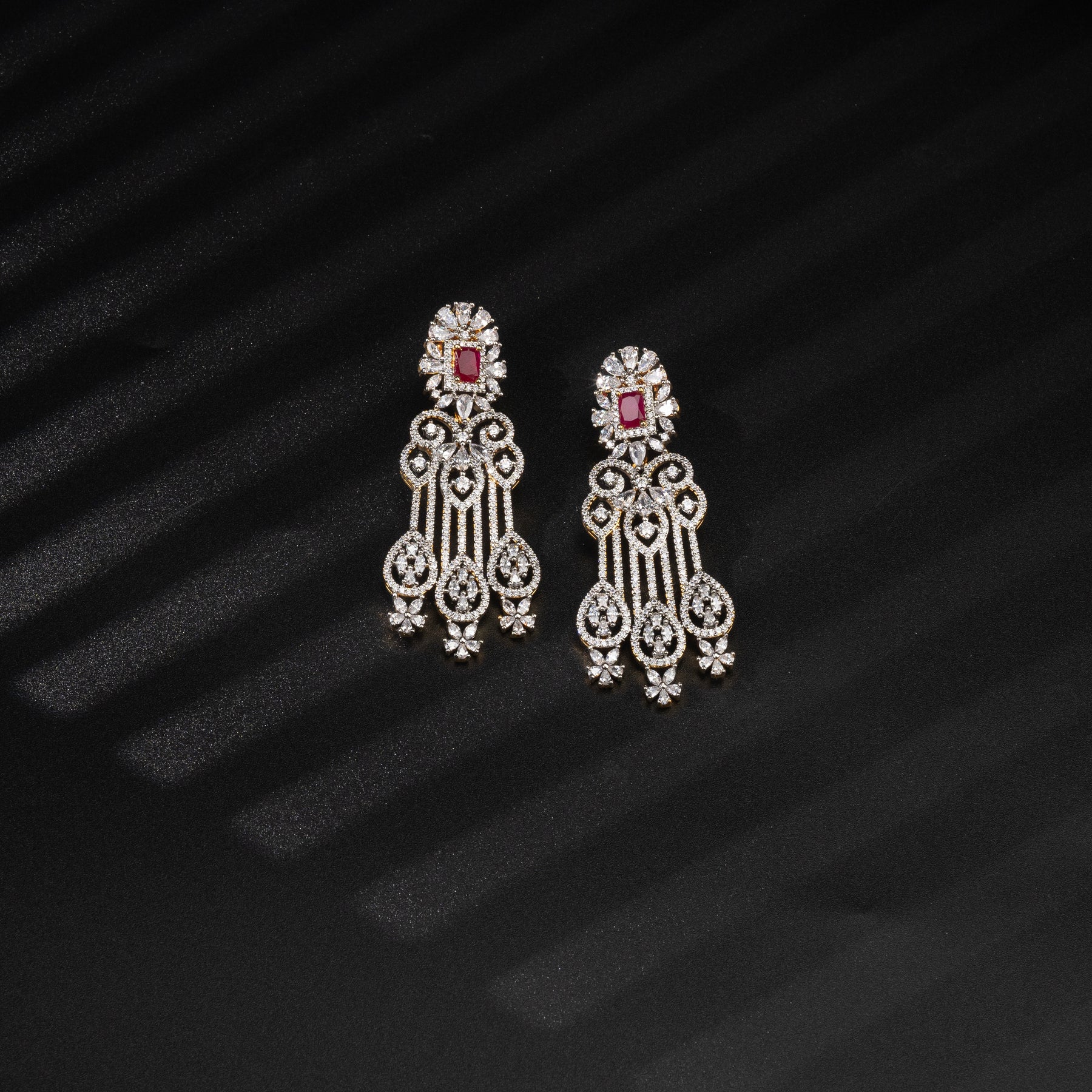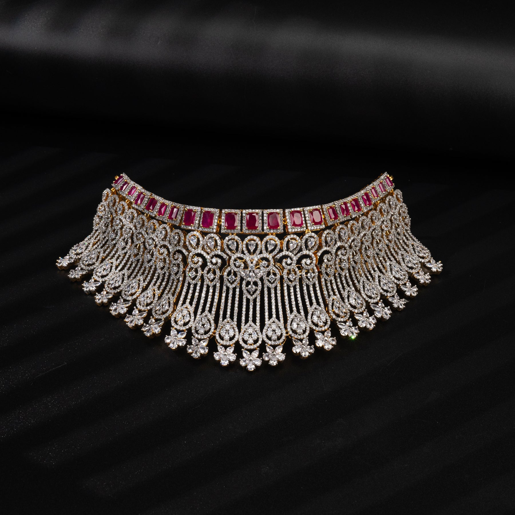 This CZ Ruby Choker features real CZ stones and semi-precious ruby stones, handcrafted to resemble dazzling diamonds. With its one-of-a-kind, exclusive design, this choker adds a touch of elegance to any outfit, making it the perfect accessory for any special occasion.