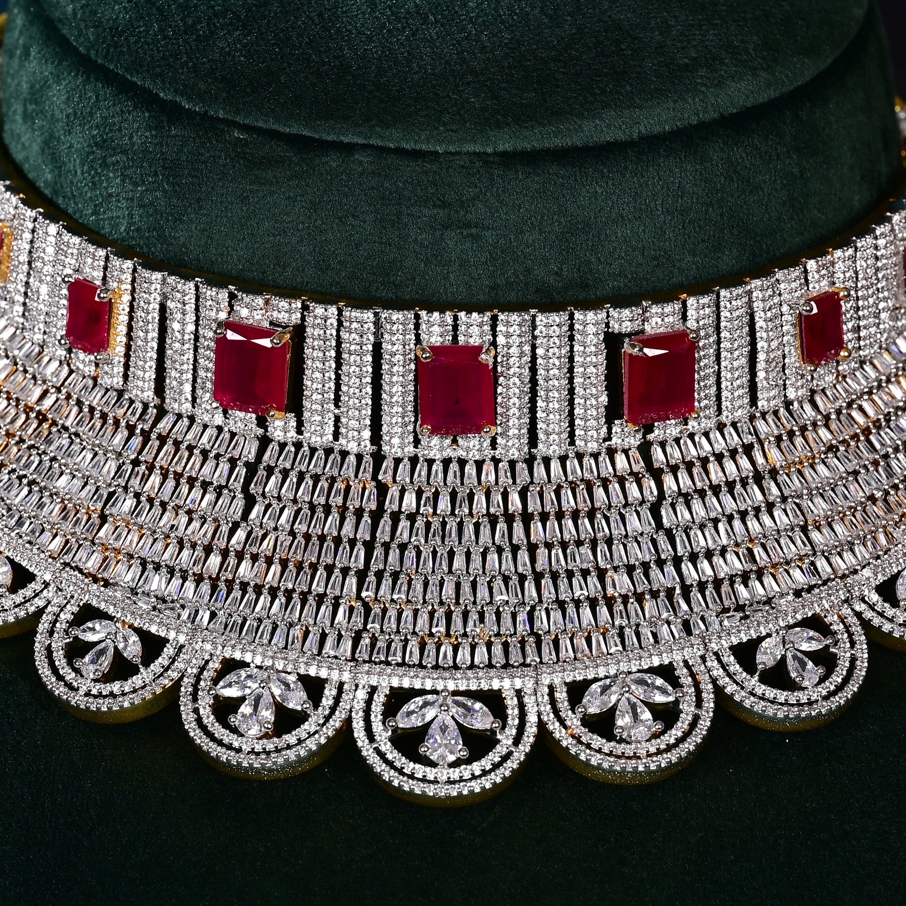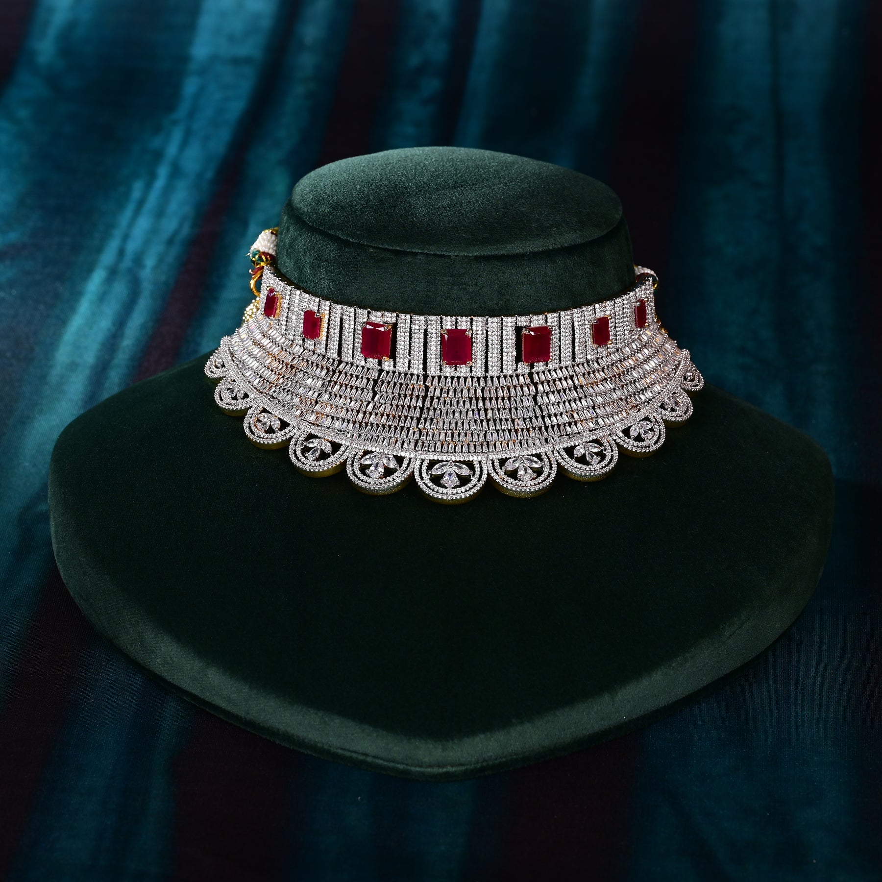 Elevate your style with our CZ Ruby Choker. The real CZ stones and semi-precious ruby stones add a touch of luxury, while the hand-crafted diamond-like design makes it truly one of a kind. Enhance any outfit with this exclusive piece.