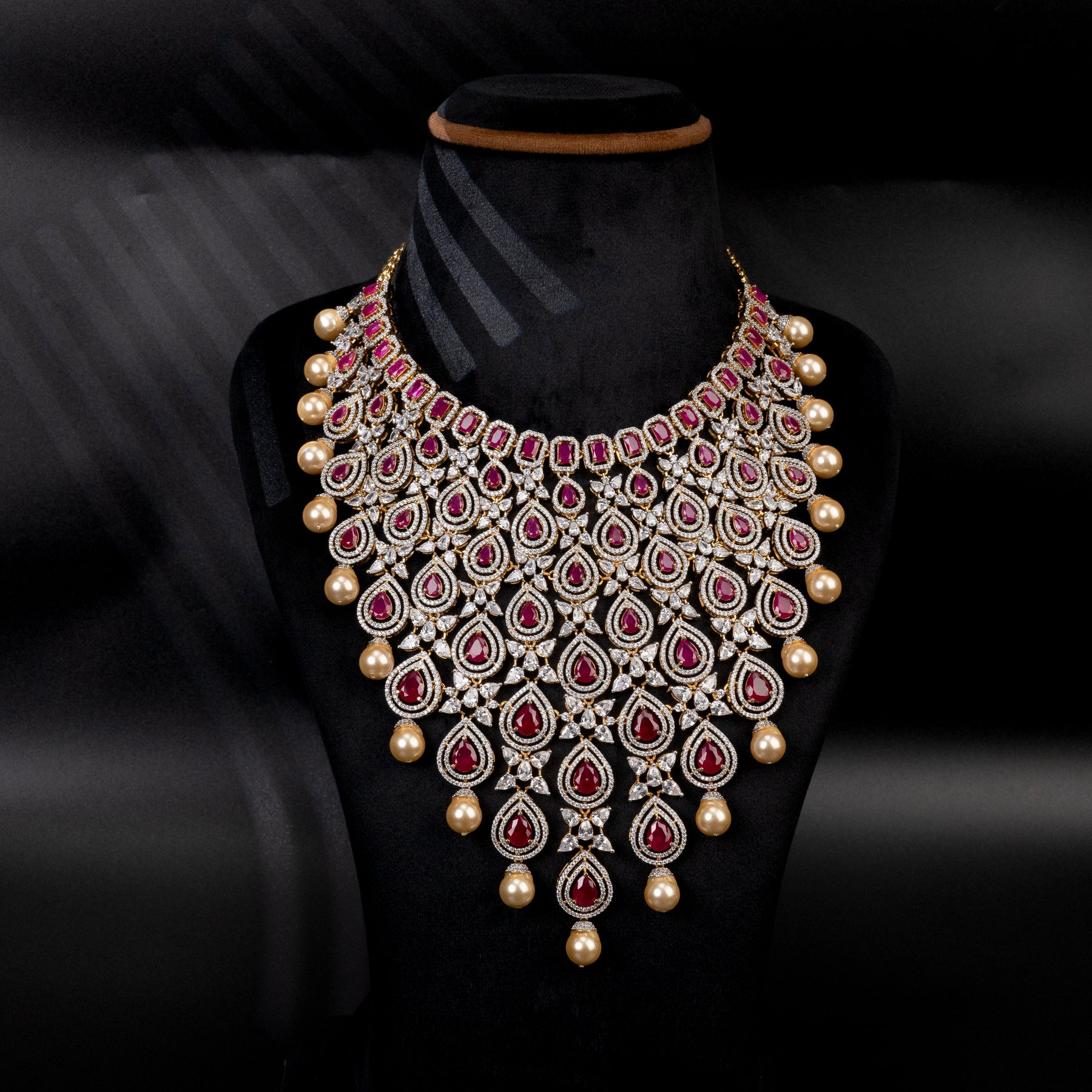 Crafted with expert precision, this one of a kind CZ Ruby Choker features real CZ stones and semi precious ruby stones that add a royal touch. Hand crafted to perfection, the choker radiates a diamond-like shine. Make a statement with this exquisite piece.