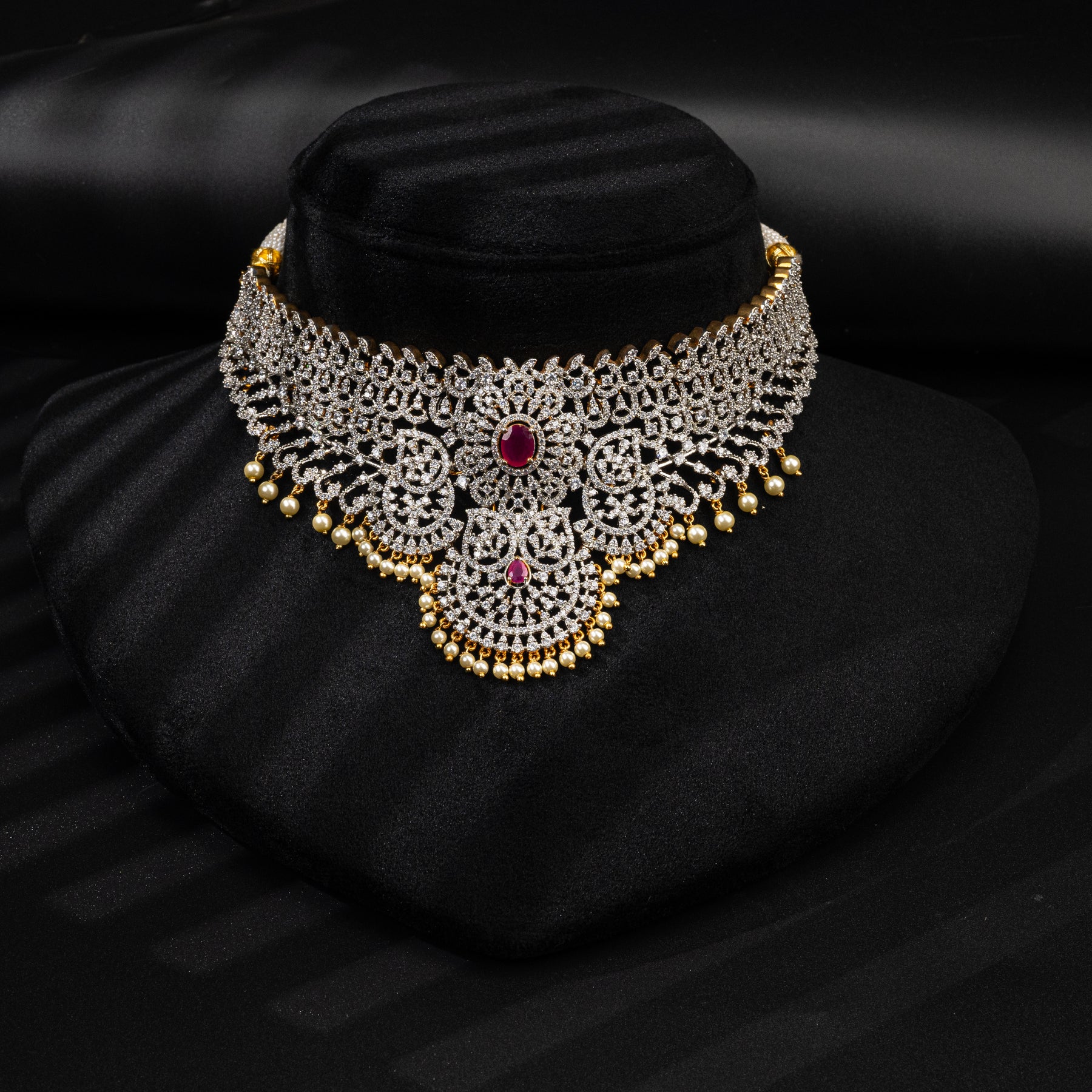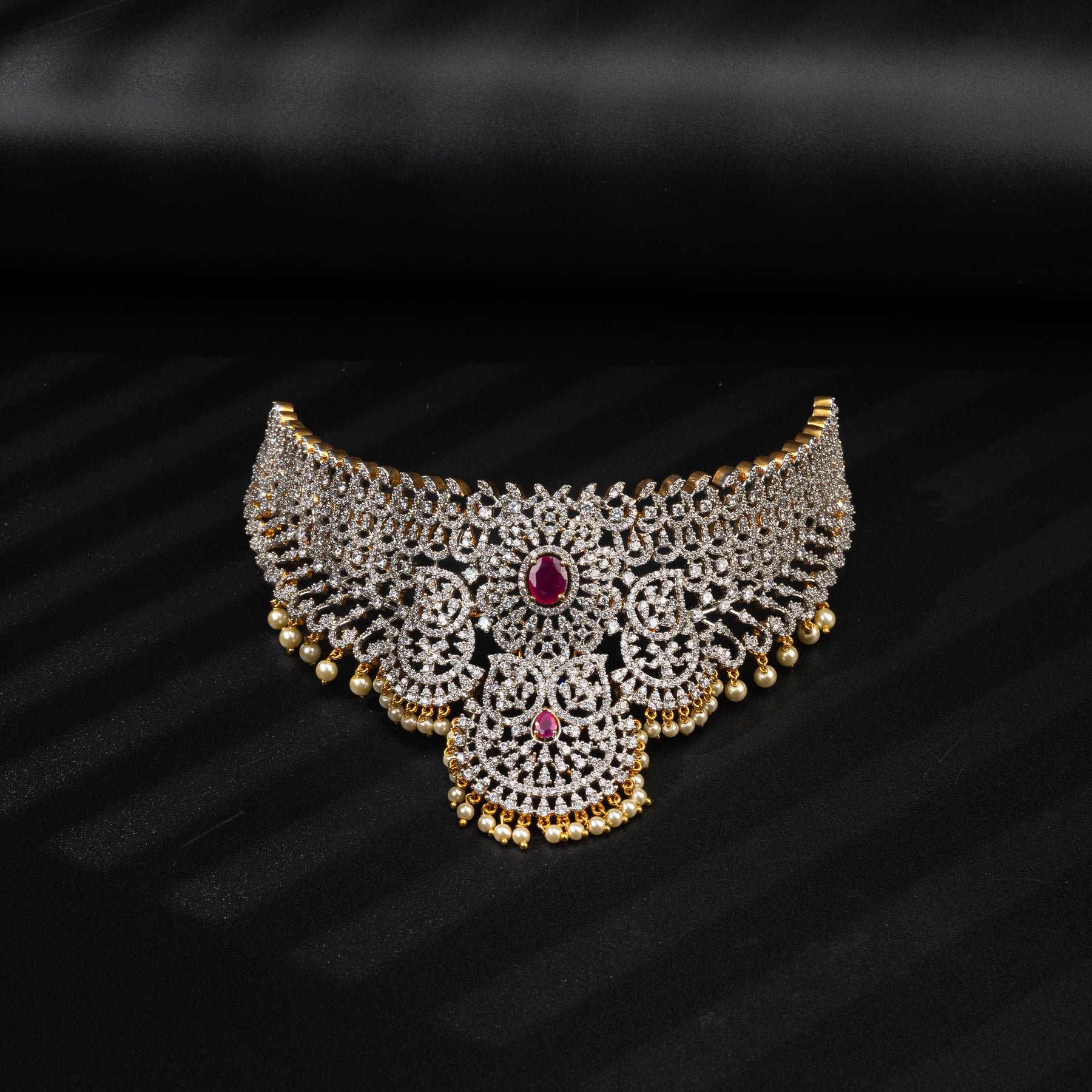 Indulge in luxury with our CZ Ruby Choker. Our hand crafted design features real CZ stones and semi precious ruby stones, giving you the look of diamonds without the steep price. With a one of a kind exclusive design, you'll make a statement that is sure to turn heads.