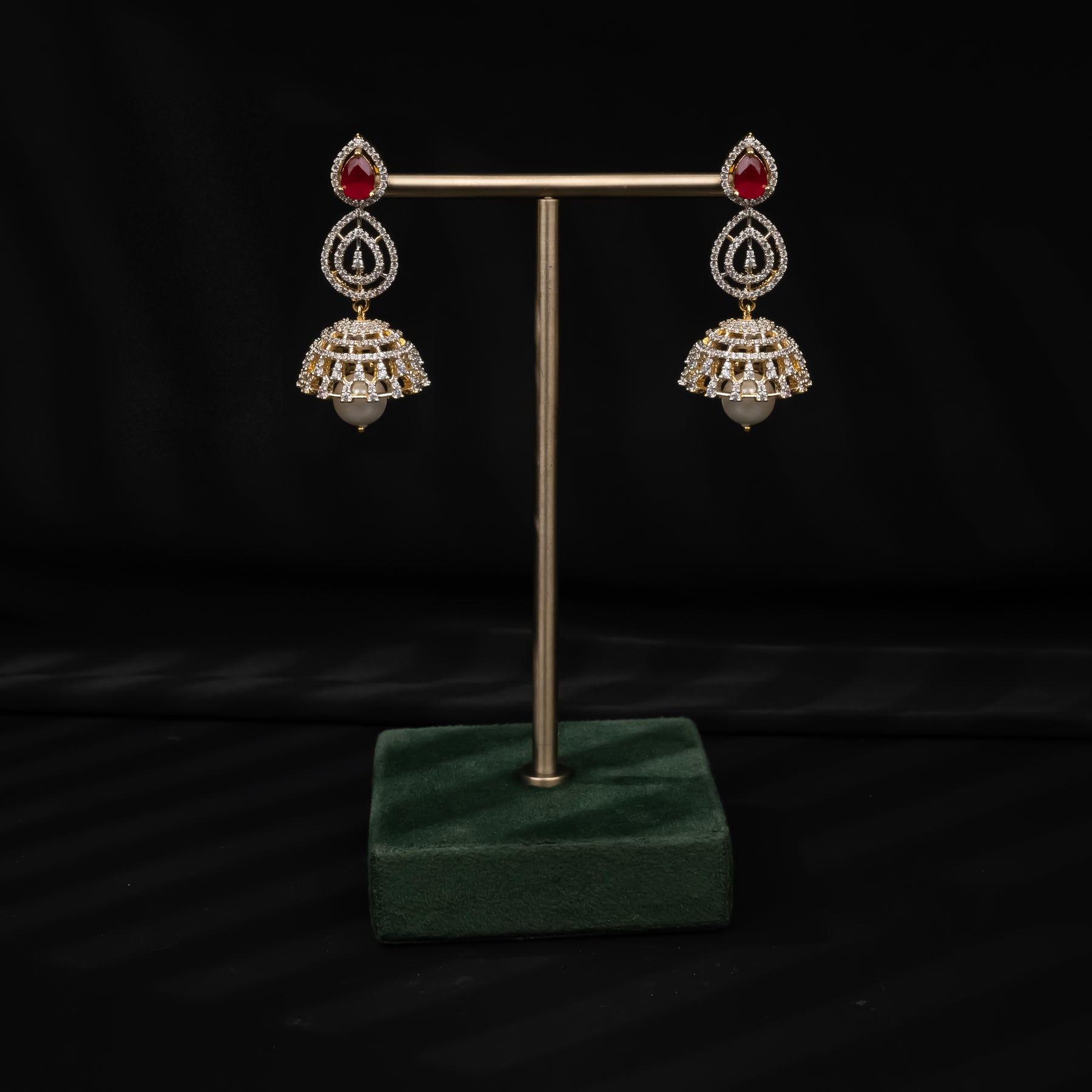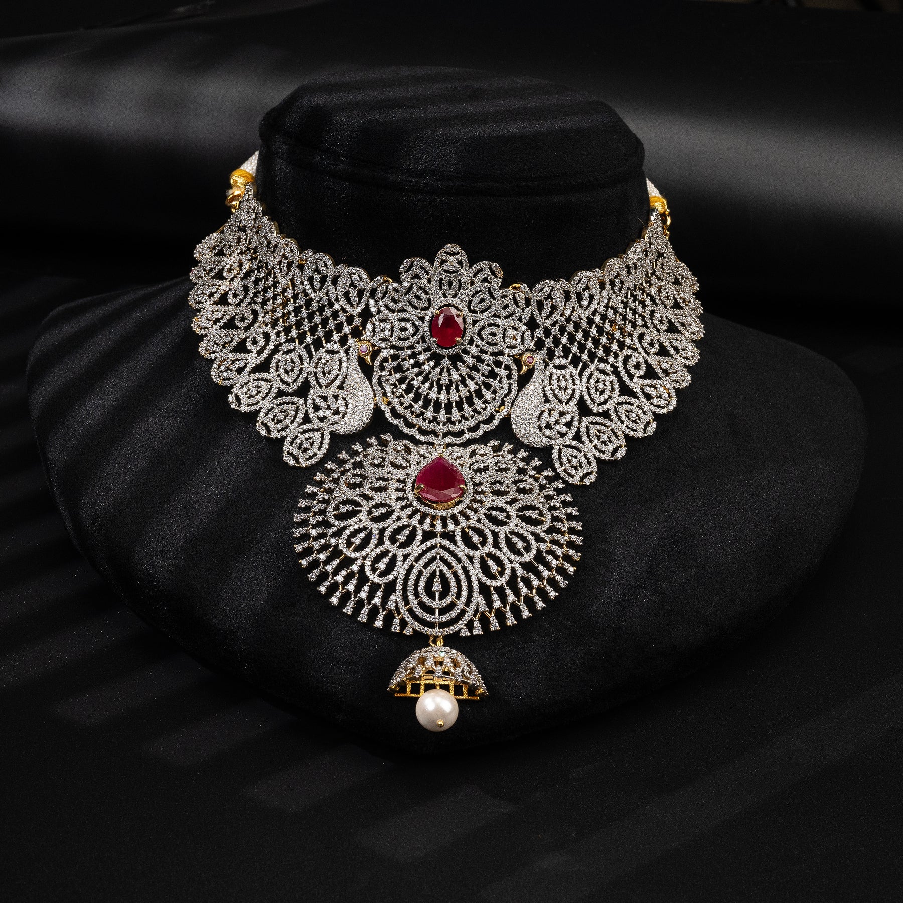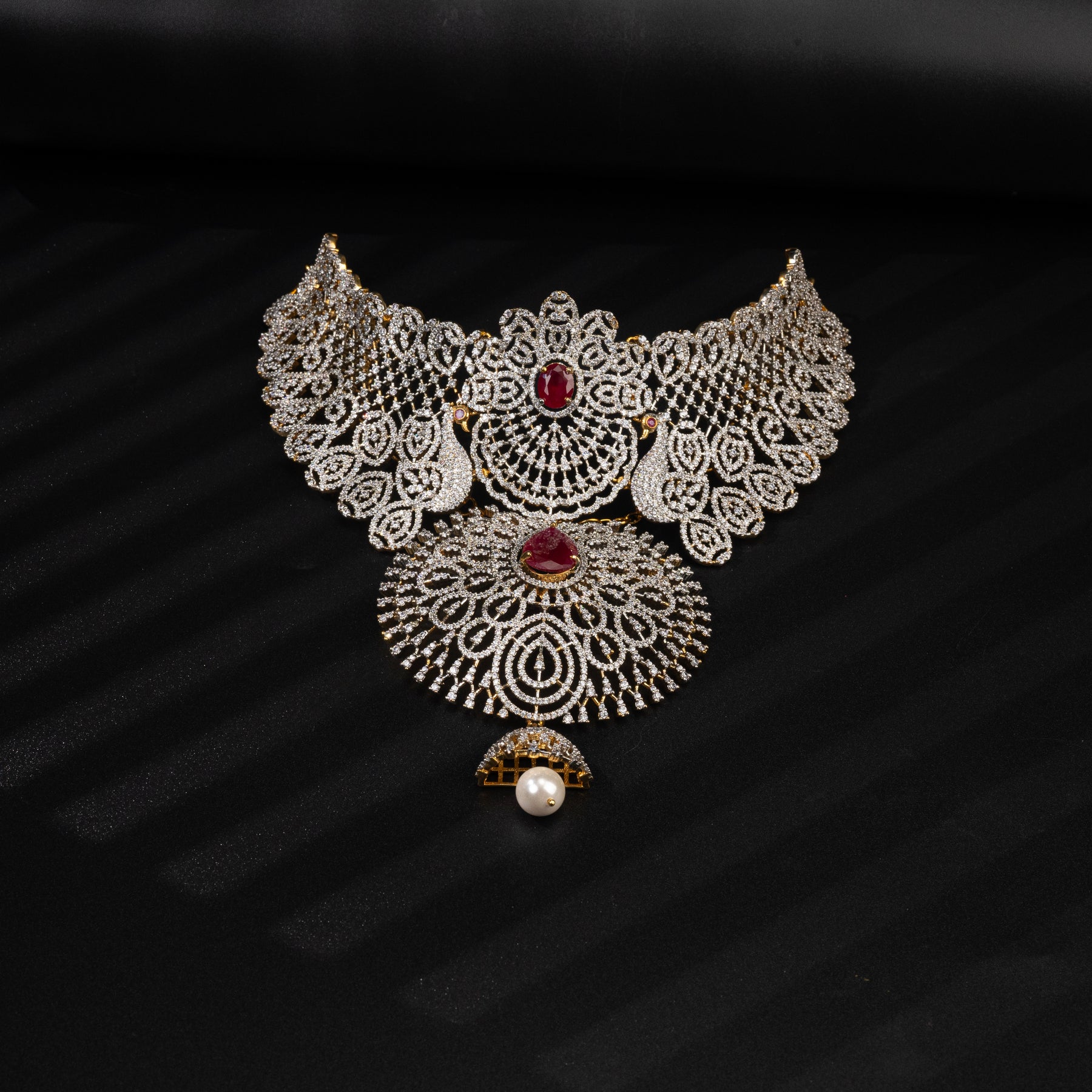 This CZ Ruby Choker features synthetic CZ stones that are expertly created to mimic the brilliance of diamonds. Alongside these are semi-precious ruby stones, carefully chosen to add a touch of color and elegance to the design. Additionally, each necklace is uniquely handcrafted, making it a truly exclusive piece.