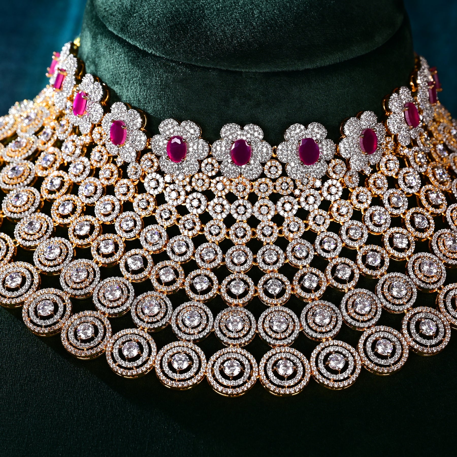 This exclusive choker set is handmade with real CZ stones that give it a diamond look. The semi precious ruby stones add a touch of elegance and luxury. Make a statement with this professionally crafted choker set that is sure to impress with its scientific and objective design.
