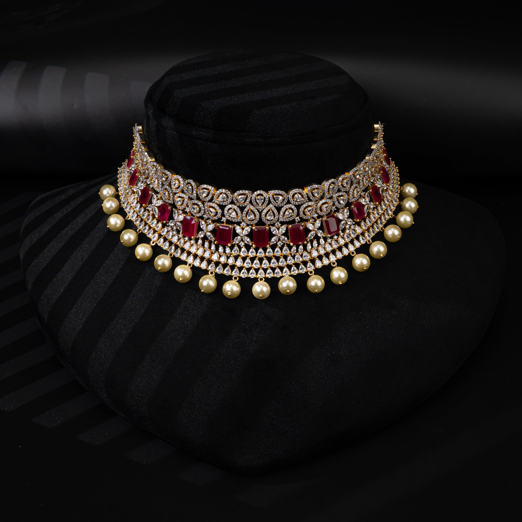 This CZ Ruby Choker features handcrafted diamond-like CZ stones and semi-precious ruby stones. With a one-of-a-kind exclusive design, this choker is perfect for adding a touch of elegance to any outfit. The CZ stones give the illusion of real diamonds, while the ruby stones add a pop of color. Elevate your look with this exquisite choker.