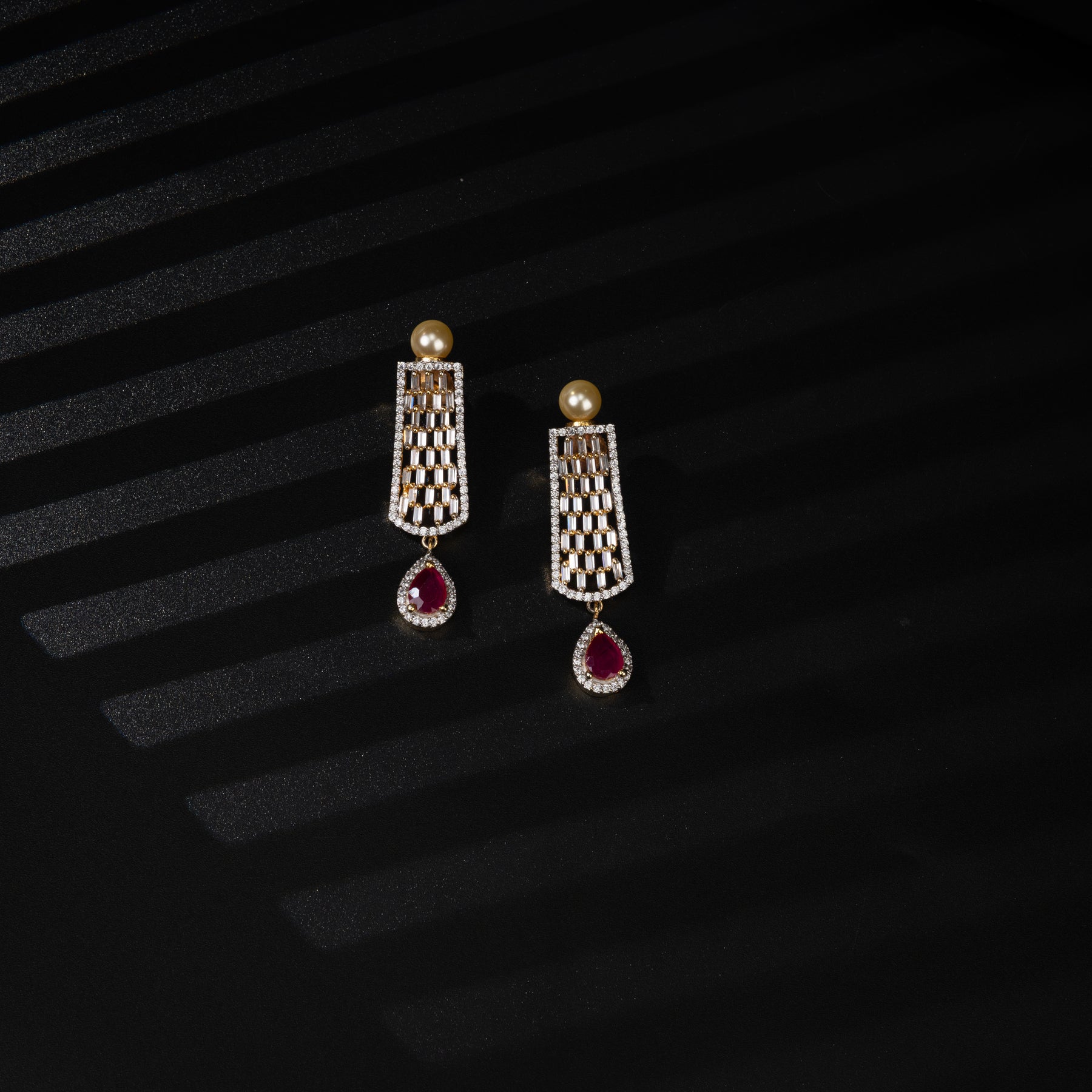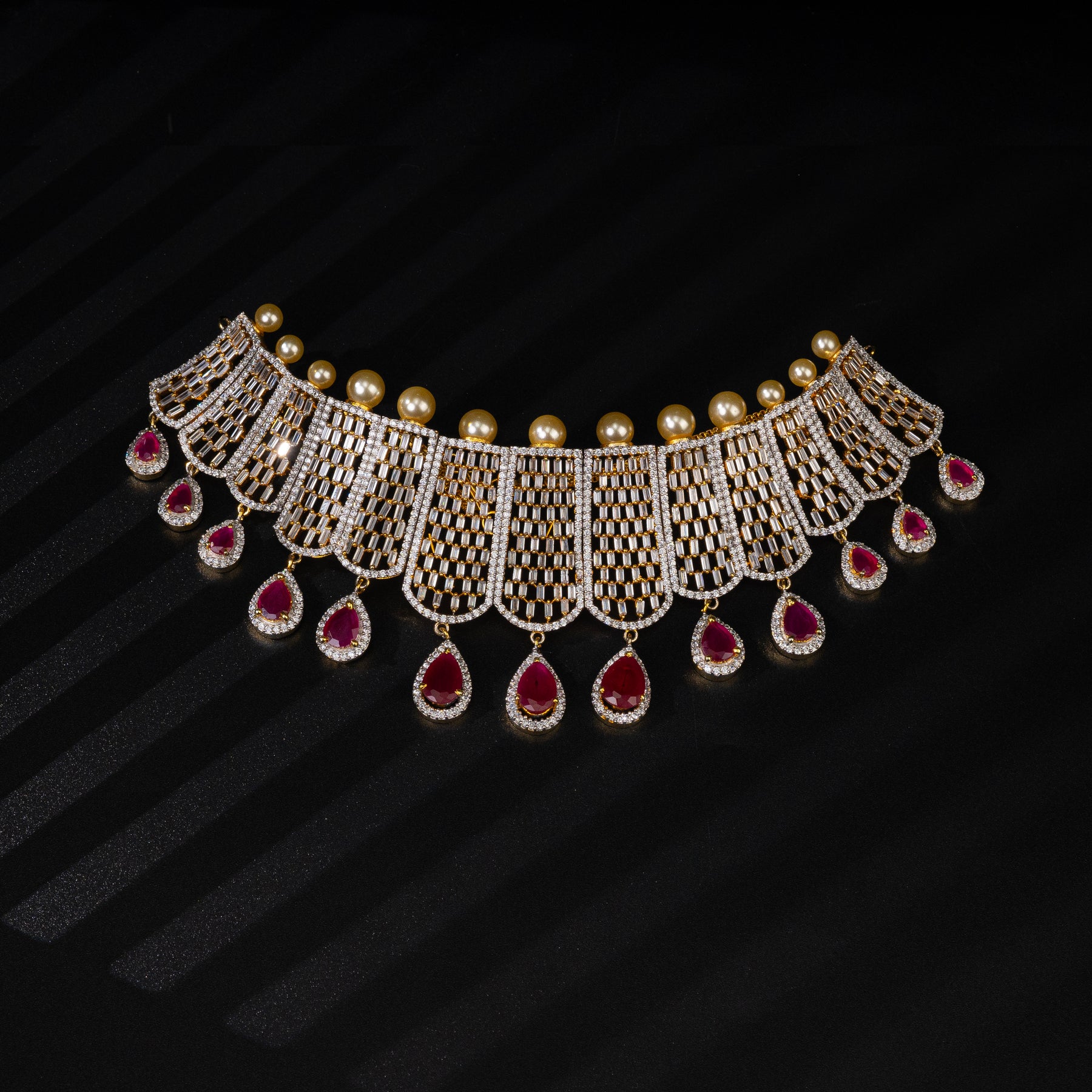 The CZ Ruby Choker is a luxurious and unique jewelry piece, hand crafted with real CZ stones and semi-precious ruby stones. Its one of a kind exclusive design features pearls and dangling rubies, giving it a diamond-like appearance. Indulge in its elegance and make a statement with this expertly crafted choker.