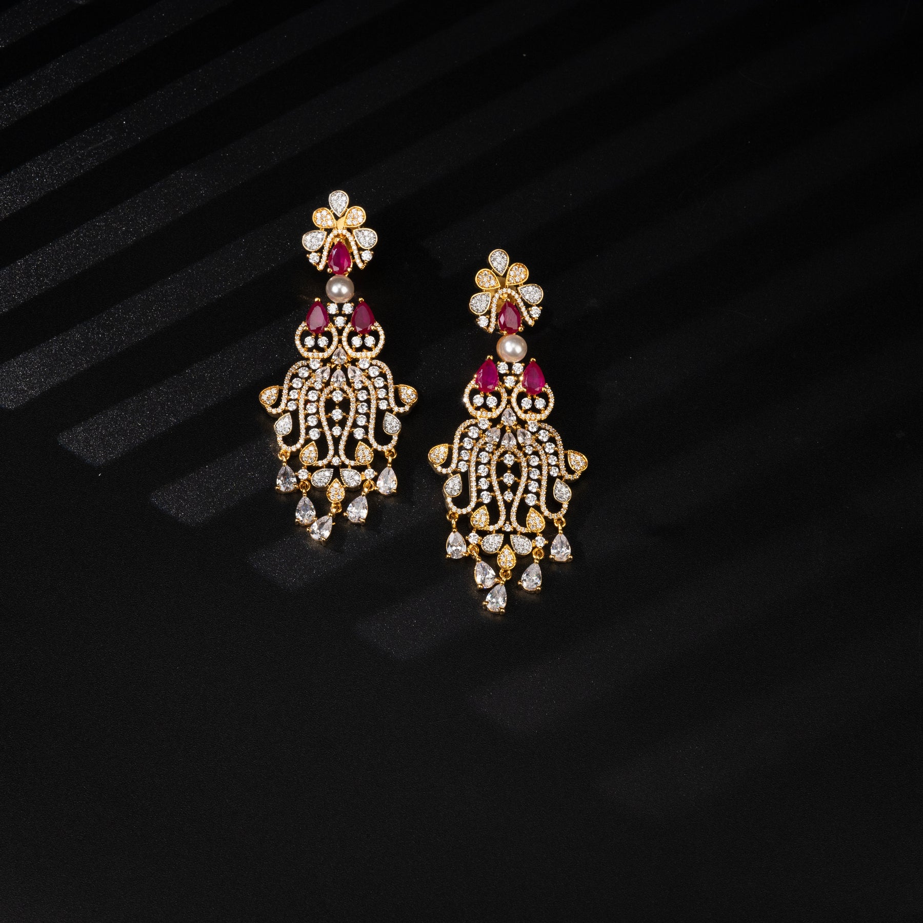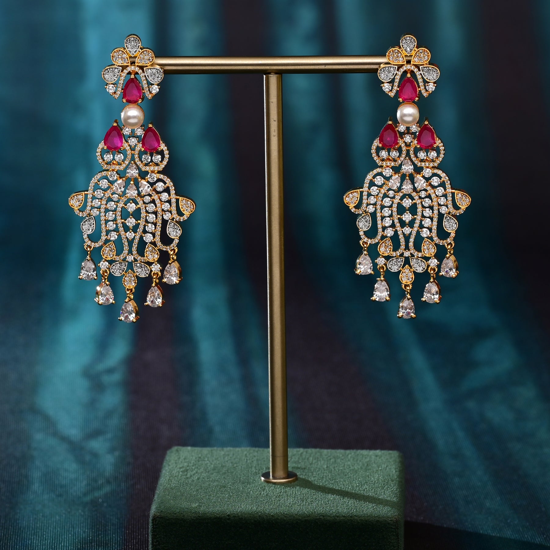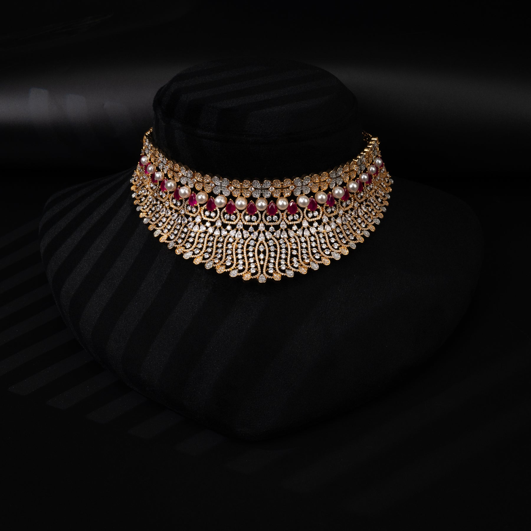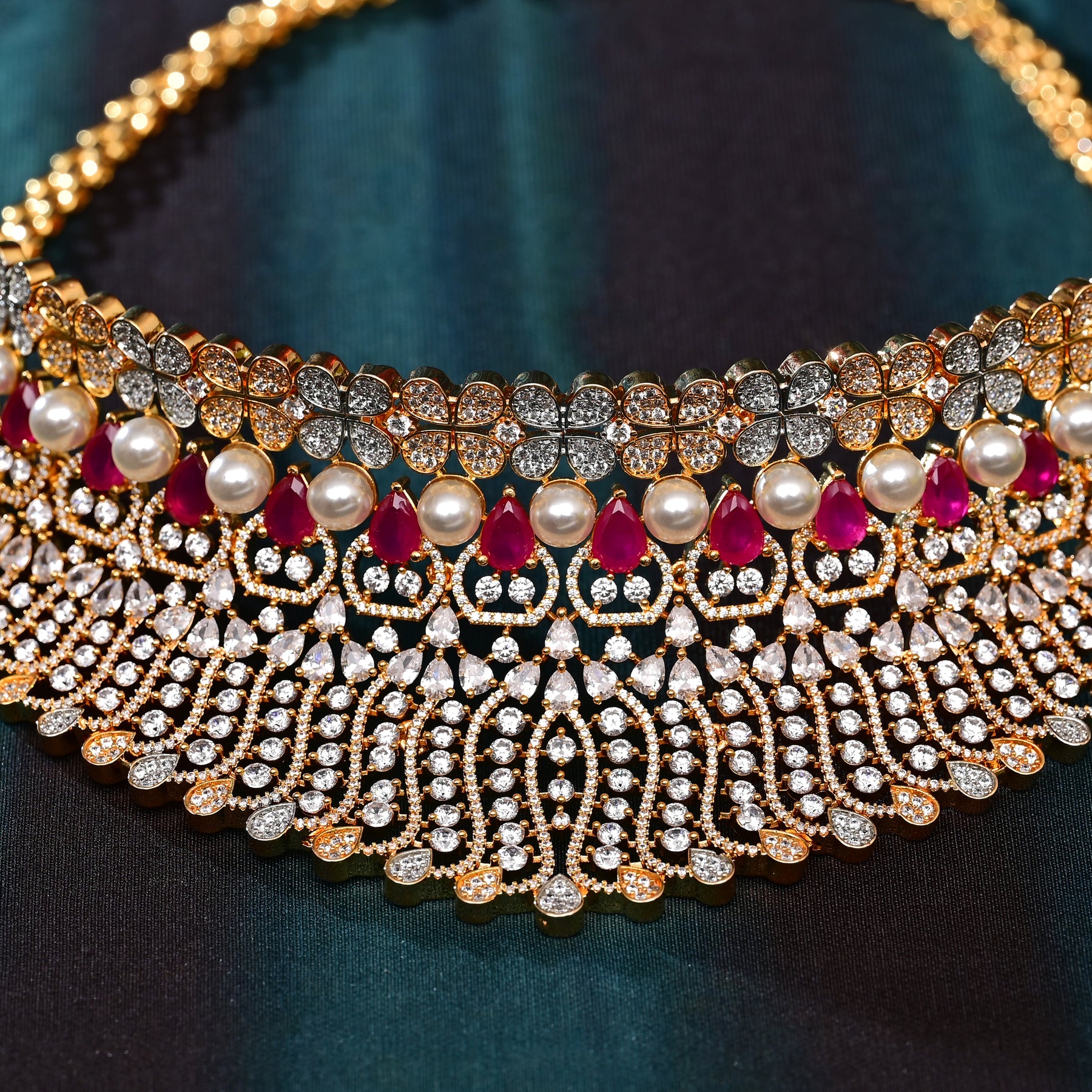 Introducing our exclusive CZ Ruby Choker, hand crafted with real CZ and semi-precious ruby stones. Experience the brilliance of diamond-like shine and the elegance of pearl embedded in this one-of-a-kind design. Elevate your look with this unique and exquisitely crafted choker.
