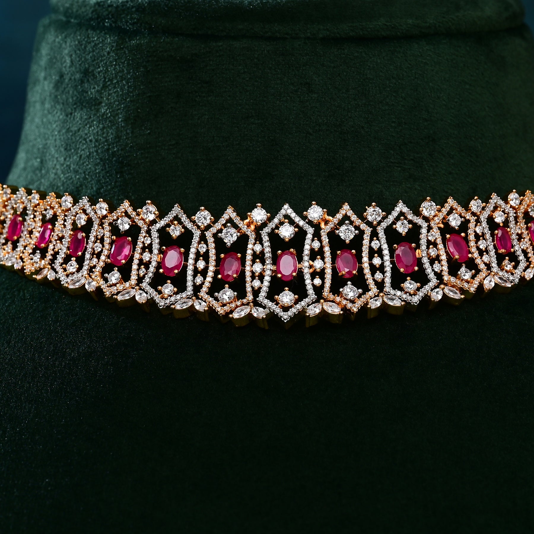 This CZ Ruby Choker is expertly handcrafted with real CZ stones and semi-precious ruby stones, creating a unique and exclusive design. The diamond-like quality of the stones adds a touch of elegance and sophistication to this stunning piece. Elevate your style with this one-of-a-kind choker.