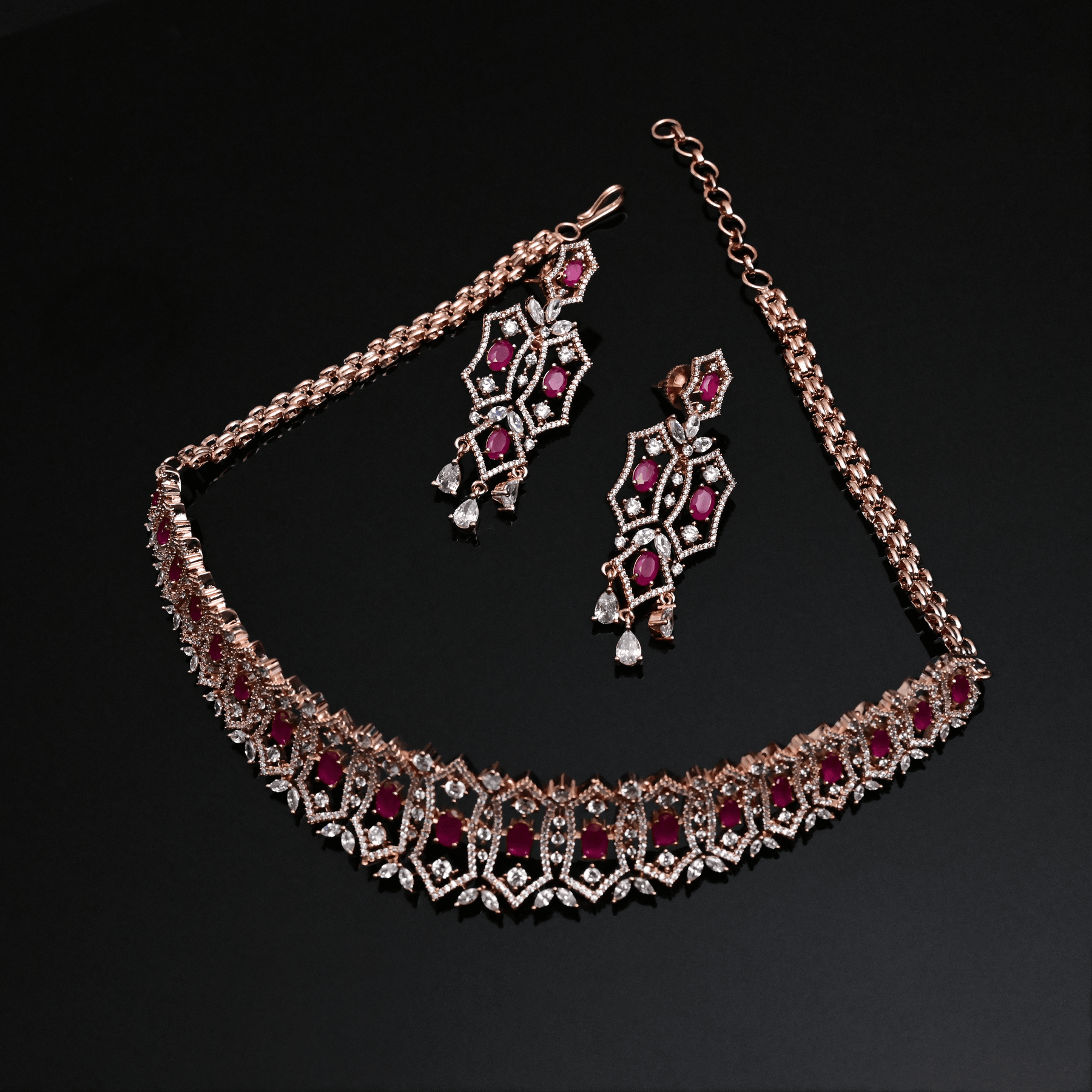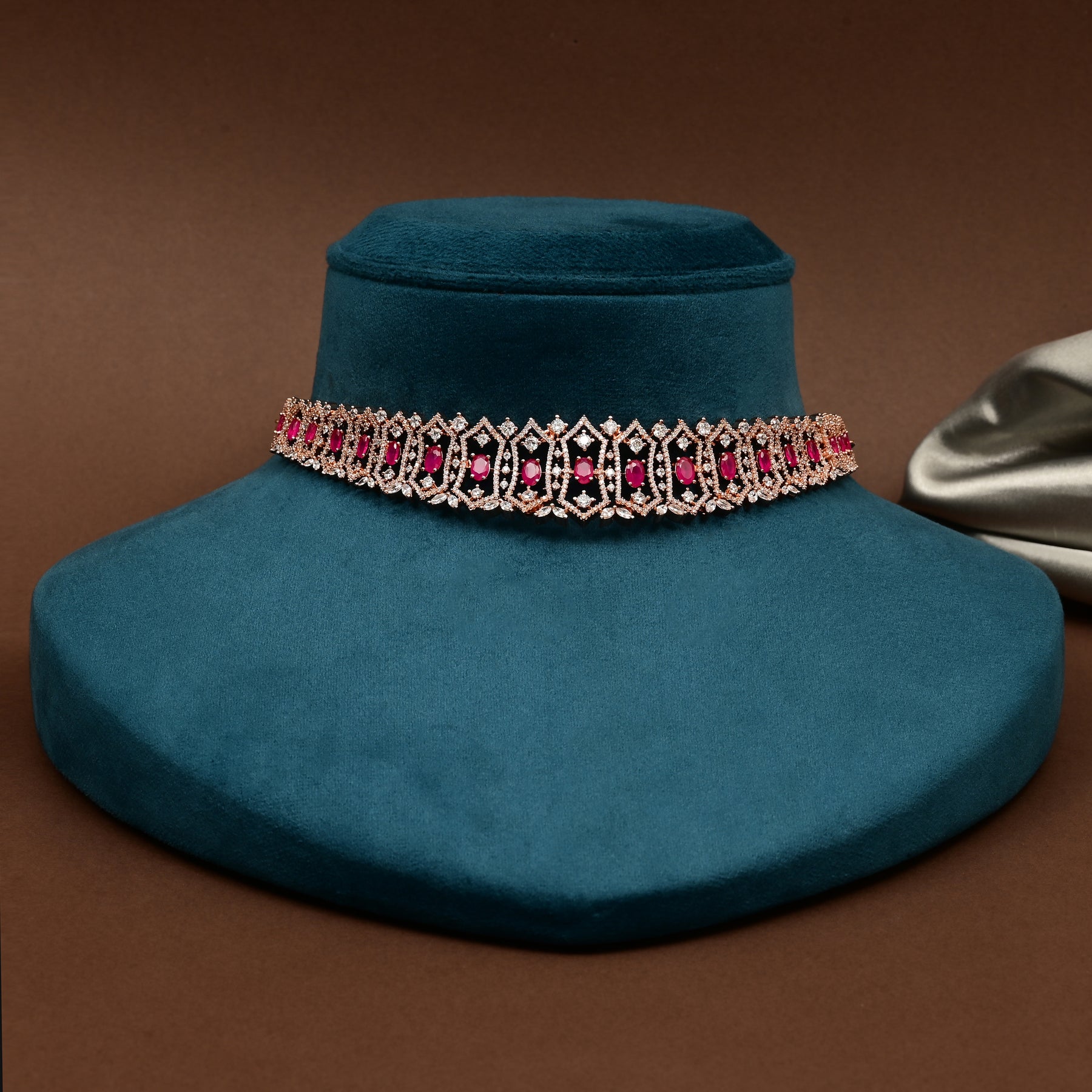 Upgrade your jewelry collection with our elegant CZ Ruby Choker. Adorned with real CZ stones and semi-precious ruby stones, this hand-crafted choker boasts a diamond-like sparkle. Its unique, exclusive design will make you stand out in any occasion. Treat yourself to a touch of luxury.