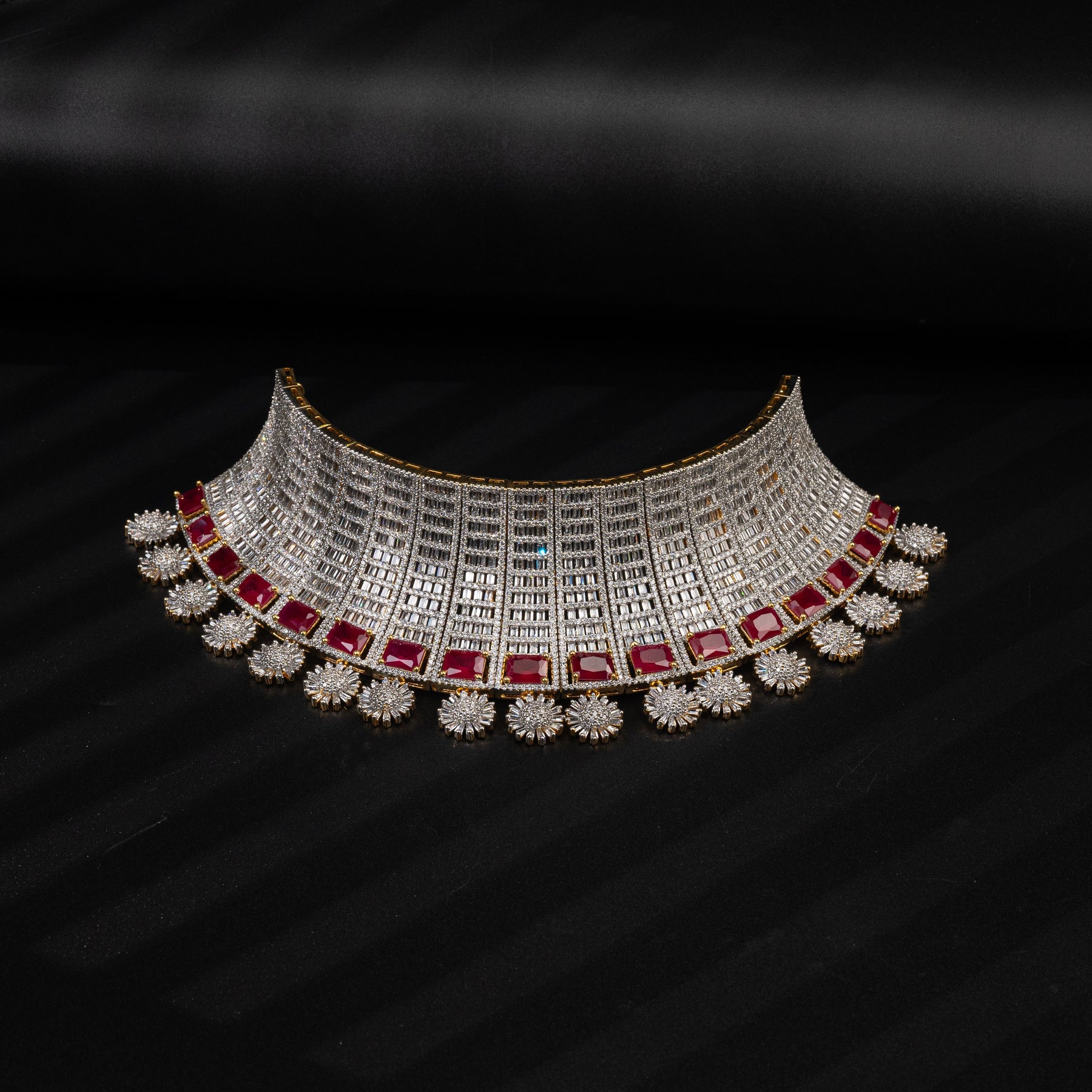 Crafted with real CZ and semi-precious ruby stones, this handmade choker set offers a stunning and exclusive diamond look. Experience the brilliance of these high-quality stones that will add a touch of elegance to any outfit. Elevate your style with this exquisite choker set.