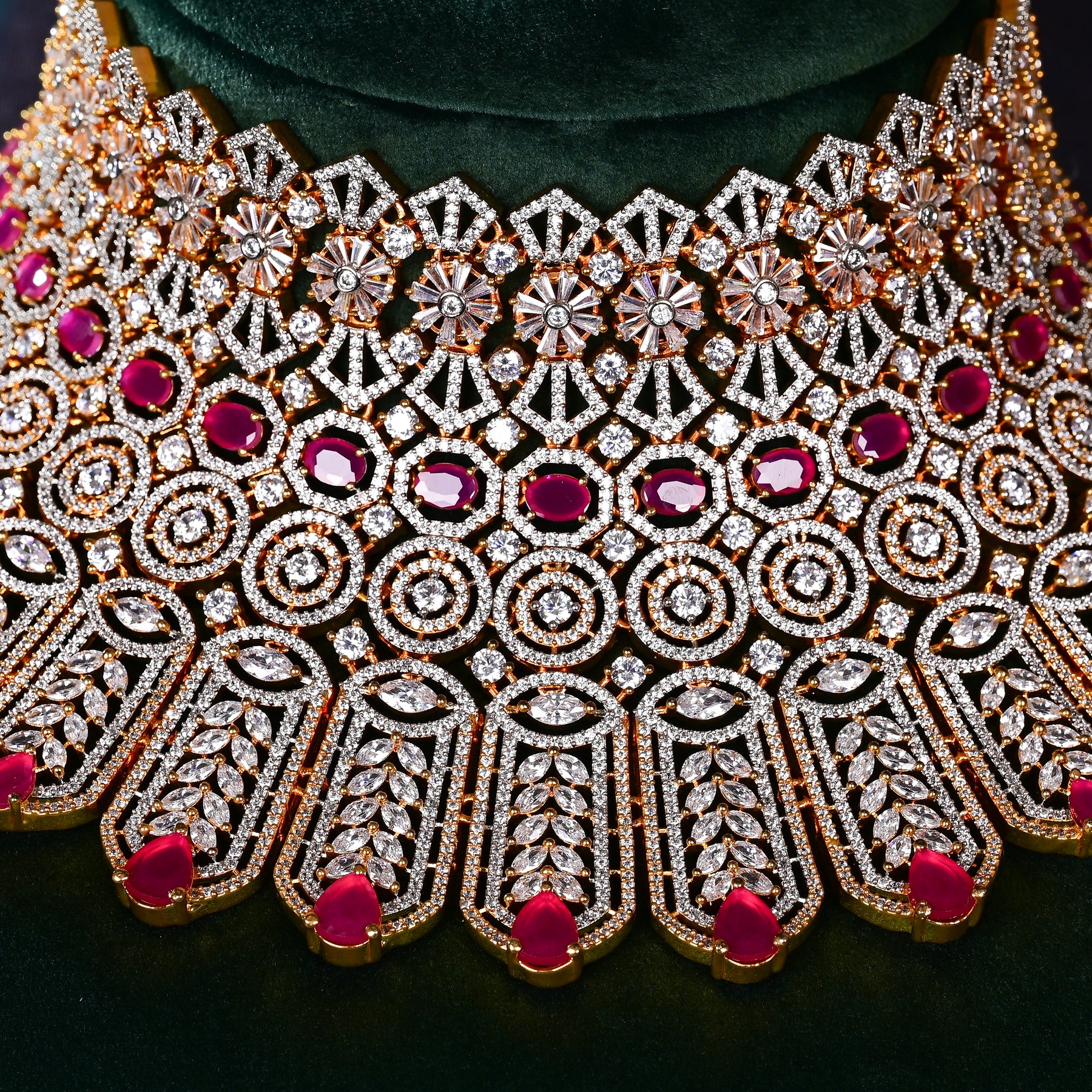 Expertly crafted with genuine cz stones and semi-precious ruby stones, this choker exudes elegance and luxury. Its handmade design gives it a unique, one-of-a-kind look with a dazzling diamond-like shine. Elevate any outfit with this exclusive necklace set.