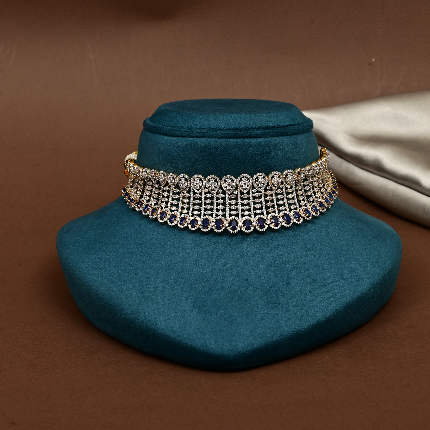 Elevate your style with our CZ Sapphire Choker. Adorned with semi-precious sapphire stones and high-quality CZ stones, this hand-crafted piece offers a stunning diamond-like look. Expertly designed and crafted, it's the perfect addition to your jewelry collection.