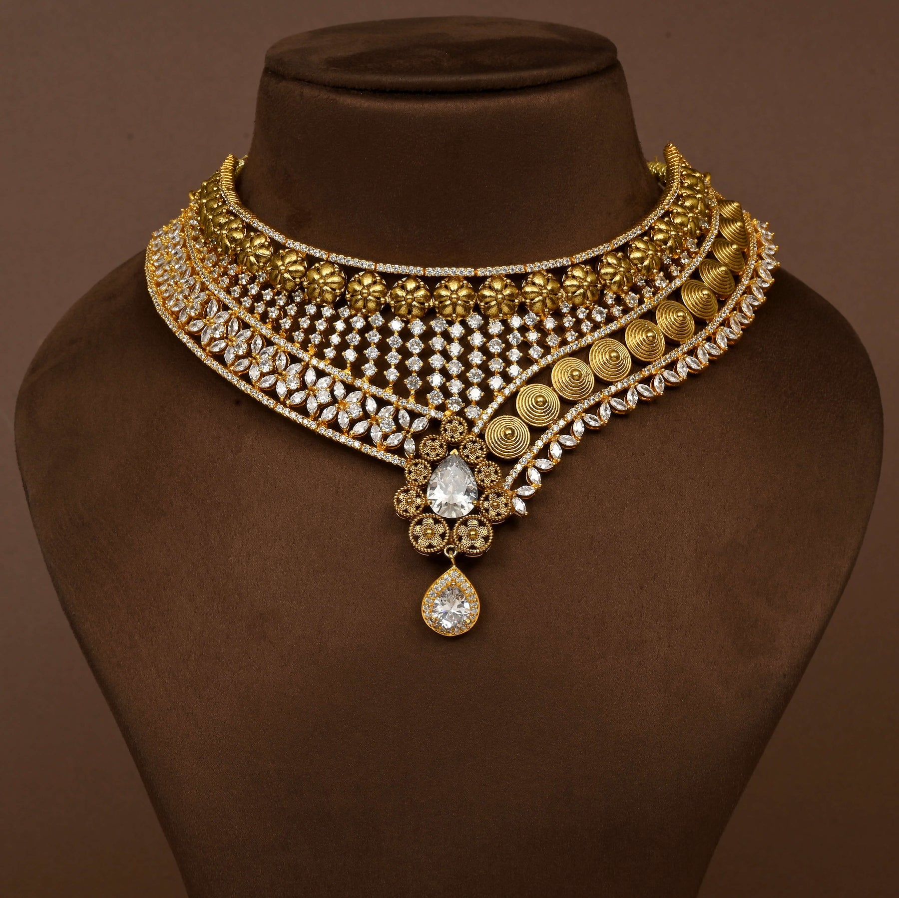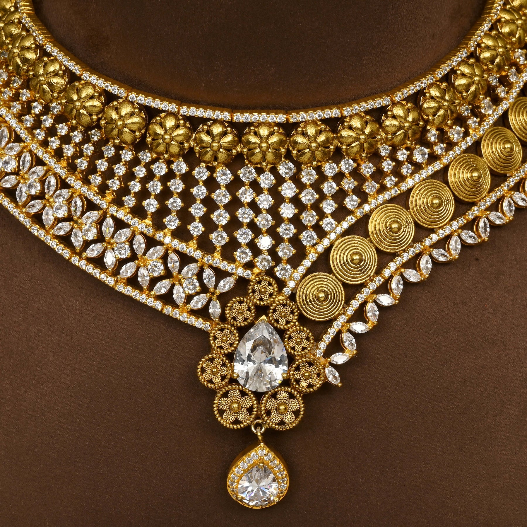 Elevate your neckline with this exquisite CZ choker set, meticulously handcrafted in lustrous gold finish. Featuring authentic cubic zirconia stones that capture light with brilliant sparkle, each piece showcases a distinctive one-of-a-kind design. The expert craftsmanship ensures superior quality and durability, making this choker an ideal choice for special occasions or everyday elegance. A timeless addition to any fine jewellery collection.