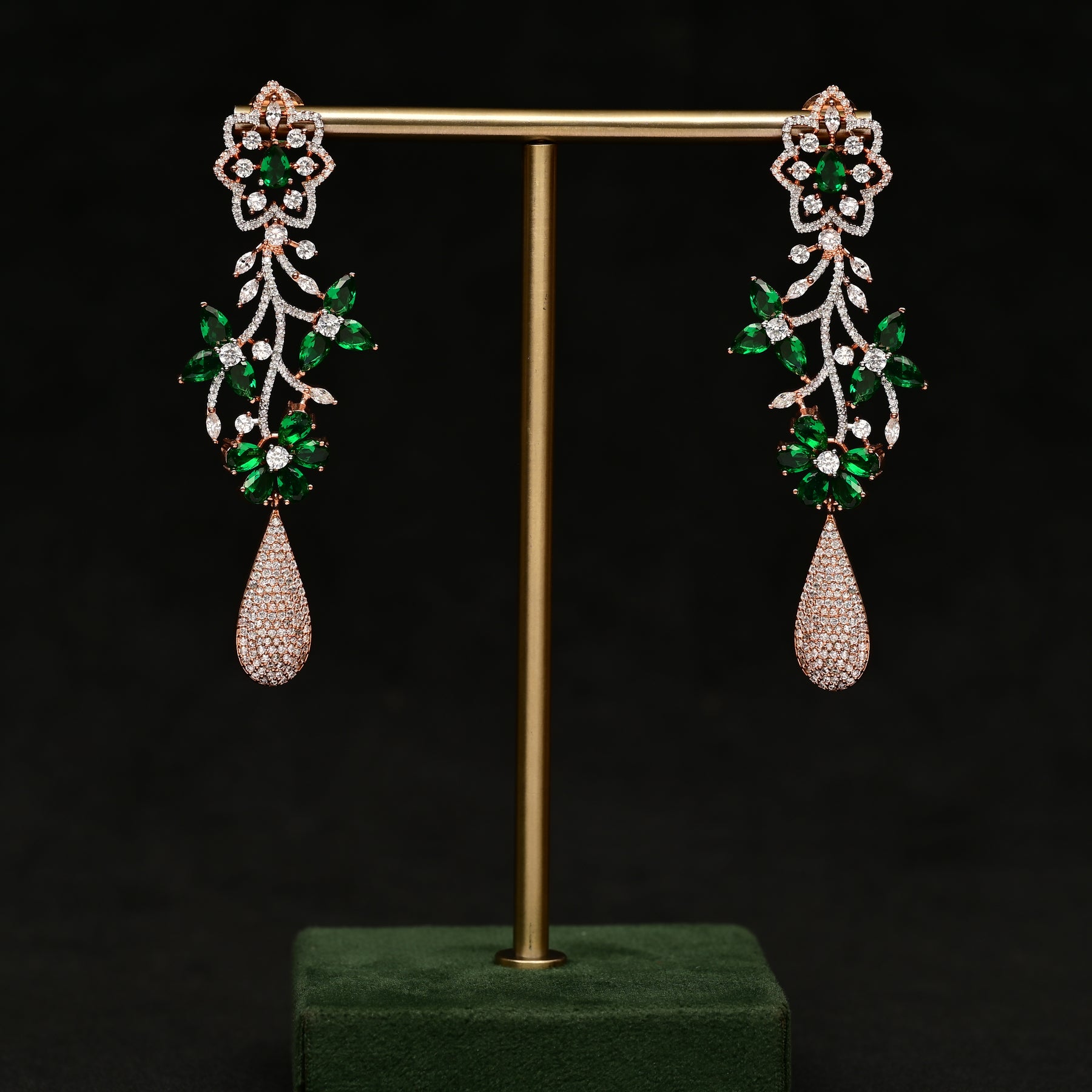 Experience the luxurious elegance of our CZ Emerald Rose Gold Earrings. Handmade with real CZ stones and semi precious emerald stones, these earrings offer a stunning diamond-like appearance. The exclusive rose gold finish adds a touch of sophistication to any outfit. Elevate your style with these exquisite earrings.