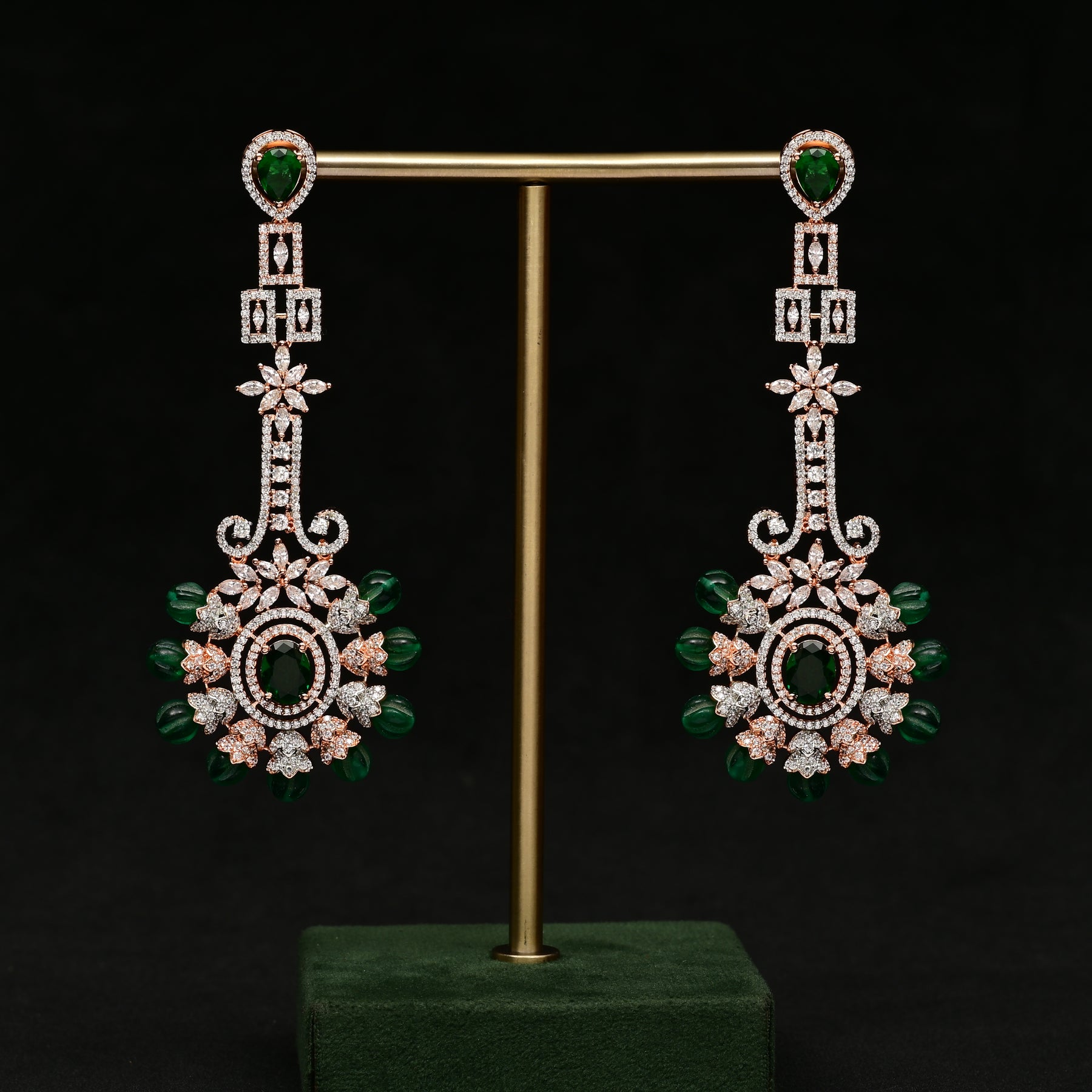 Enhance your look with our CZ Rose Gold Designer Earrings featuring real cz stones and semi precious emerald pumpkin beads. Handcrafted with a real diamond look and exclusive rose gold finish, these earrings exude elegance and style. Perfect for any occasion, elevate your wardrobe with these sophisticated and unique earrings.