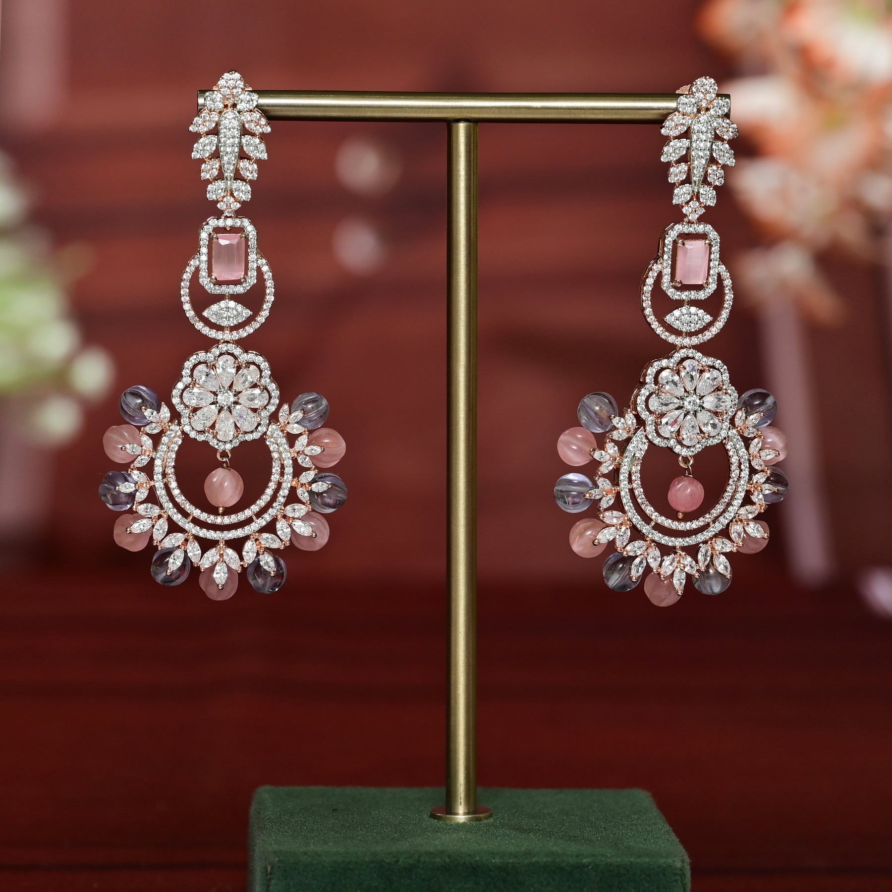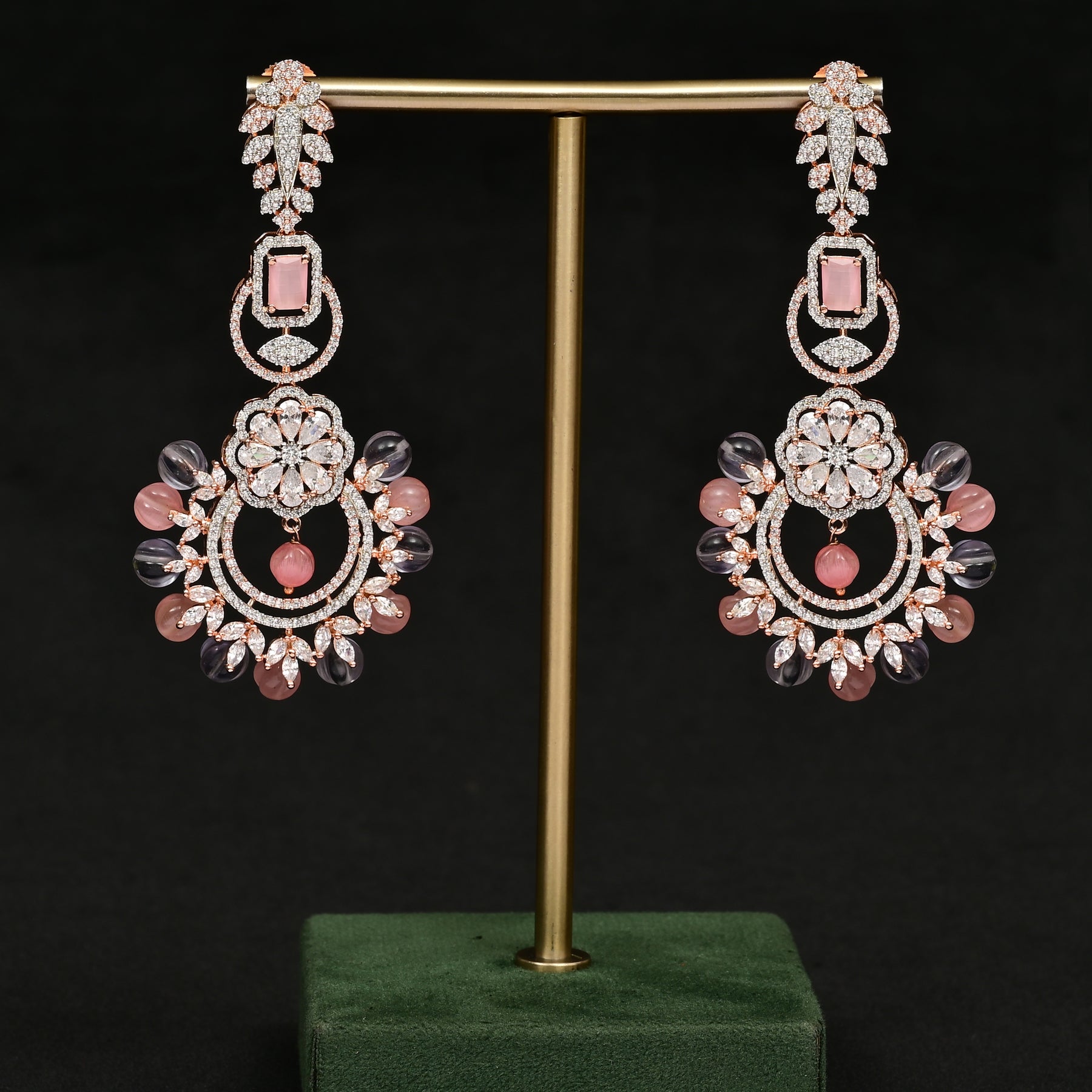 Expertly crafted with real cz and semi-precious multicolor stones, these exclusive rose gold finish earrings offer a stunning diamond-like appearance. Handmade by skilled artisans, these earrings are a must-have for any jewelry collection. Elevate any outfit with these elegant and versatile earrings.