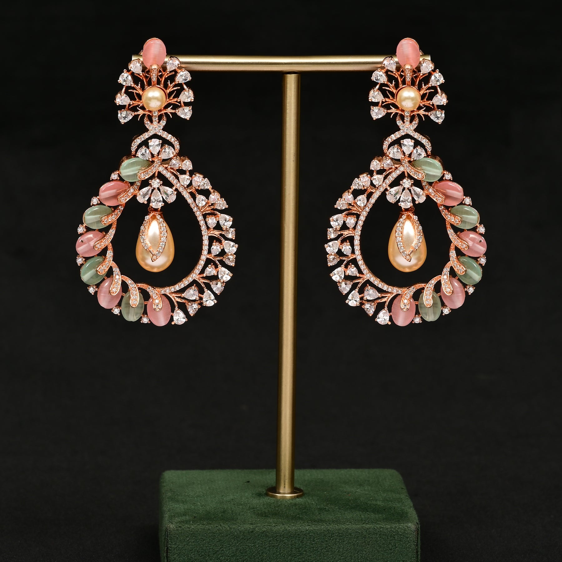 Achieve a luxurious and sophisticated look with our CZ Rose Gold Earrings. These earrings feature real CZ stones and semi-precious multicolor stones, giving them a unique and eye-catching design. Handmade with an exclusive rose gold finish, they provide a diamond-like appearance without the high cost. Elevate your style with these elegant and radiant earrings.