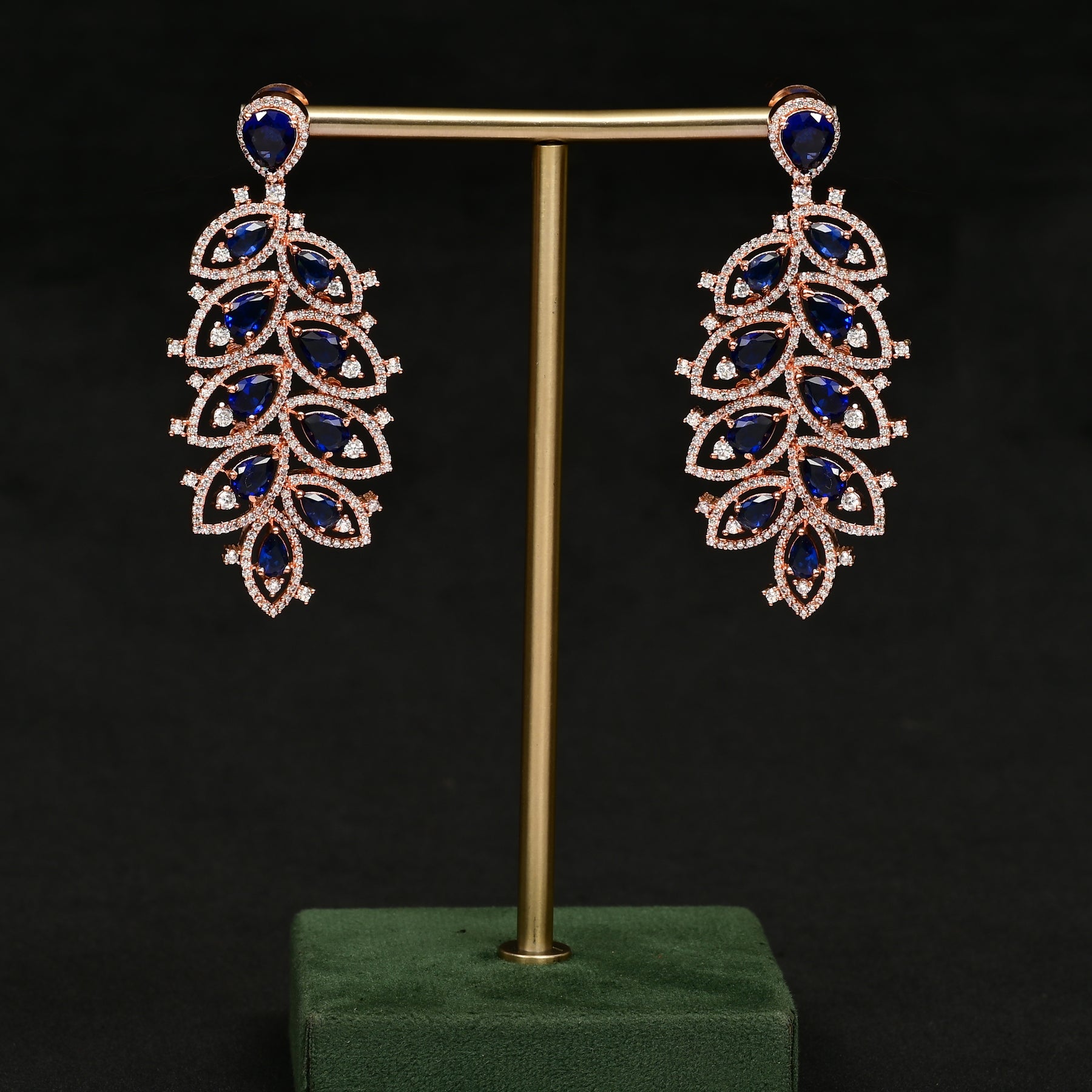 Expertly crafted, these CZ Rose Gold Earrings feature real CZ stones and semi-precious blue sapphire stones. Their handmade design gives them a real diamond look, while the exclusive rose gold finish adds a touch of elegance. A must-have for any jewelry lover.