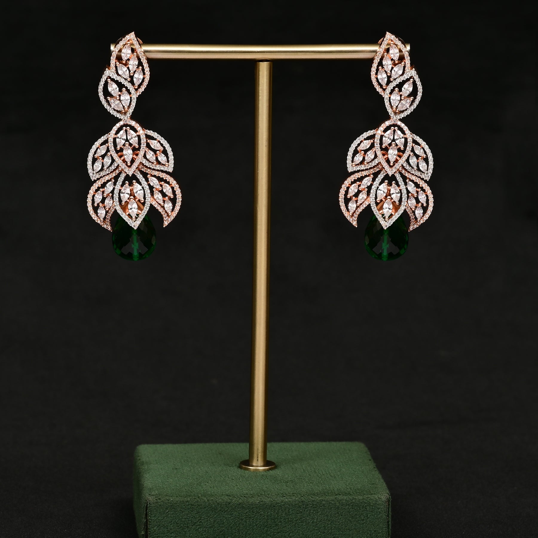 Indulge in pure elegance with our CZ Rose Gold Earrings. Each piece is adorned with real CZ stones and semi-precious emerald stones, expertly crafted for a luxurious diamond-like finish. Handmade with an exclusive rose gold finish, these earrings are the perfect statement piece for any occasion.
