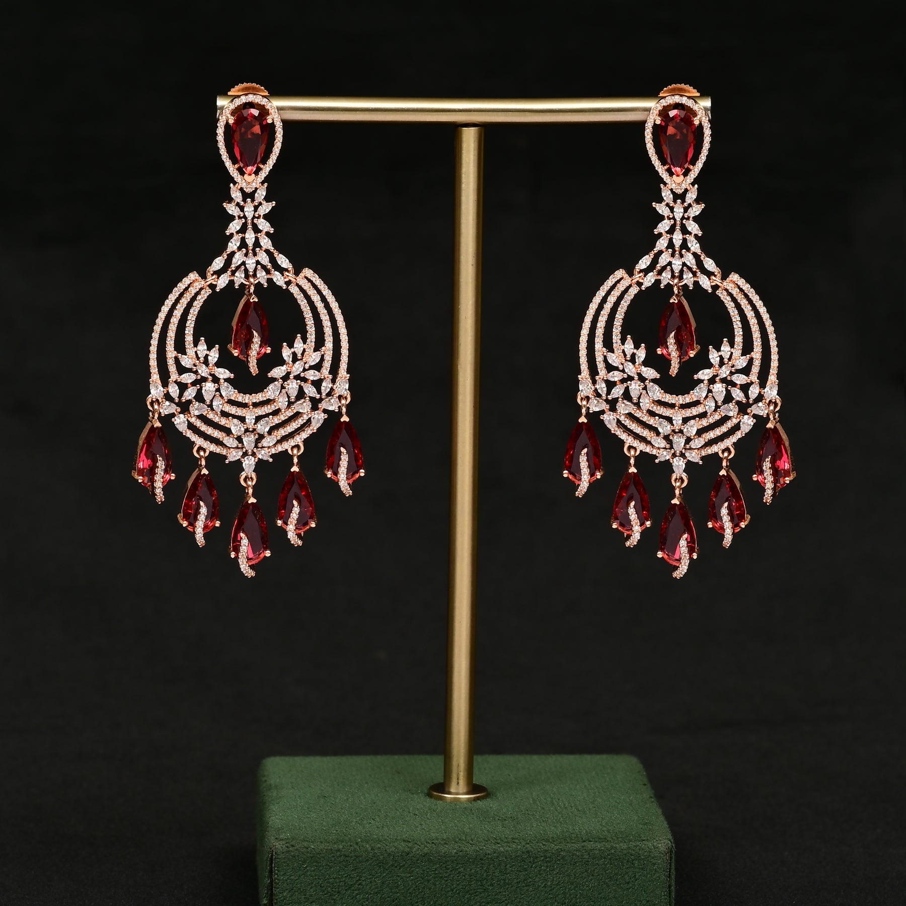 Experience luxury with our CZ Rose Gold Earrings. Handcrafted with real CZ stones and semi-precious ruby stones, these earrings boast a stunning rose gold finish that exudes a diamond-like shine. Elevate any outfit with these elegant, expertly crafted earrings.