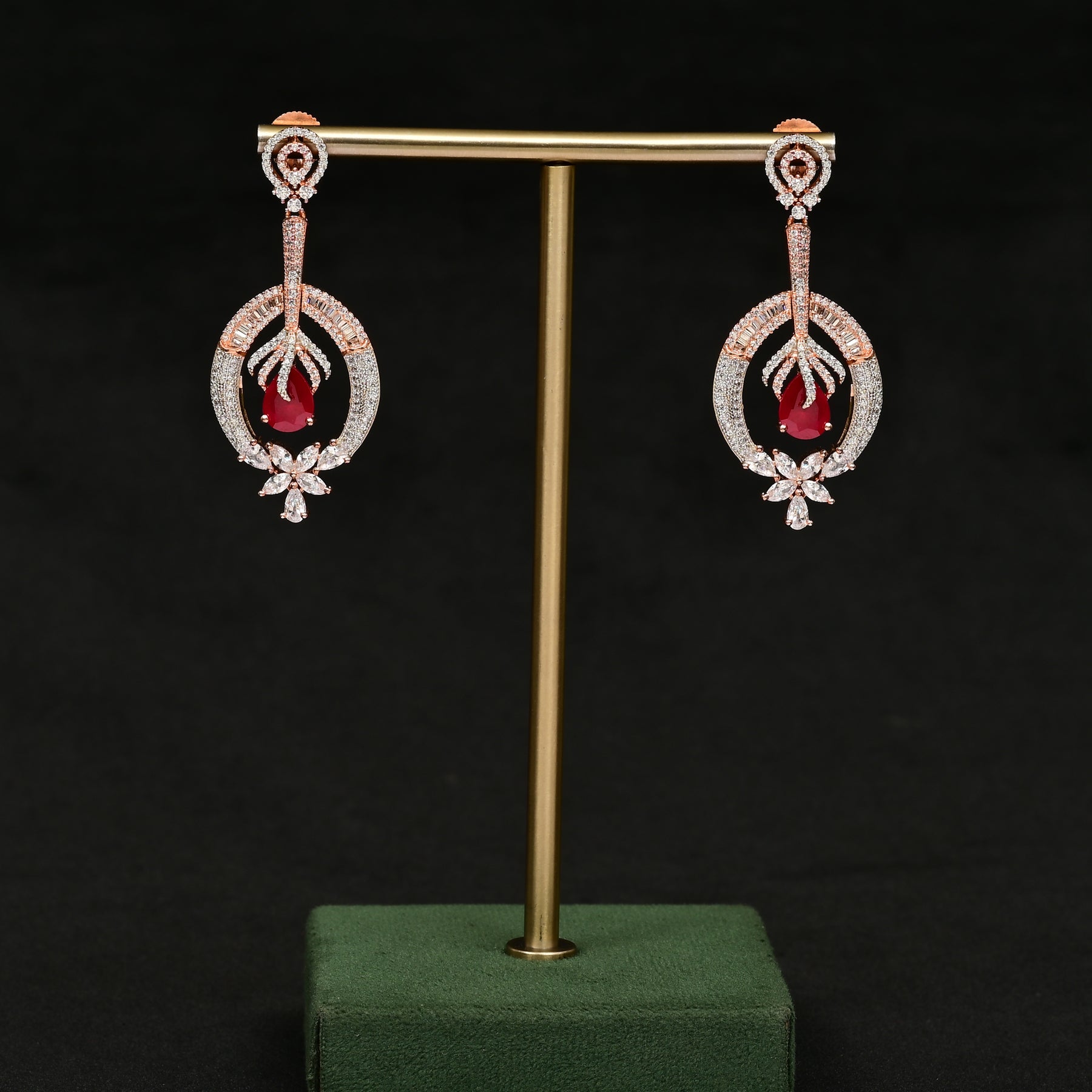 These exquisite CZ Rose Gold Earrings feature real cz stones and semi precious ruby stones, handcrafted with an exclusive rose gold finish for a dazzling and luxurious diamond look. Perfect for adding a touch of elegance to any outfit.