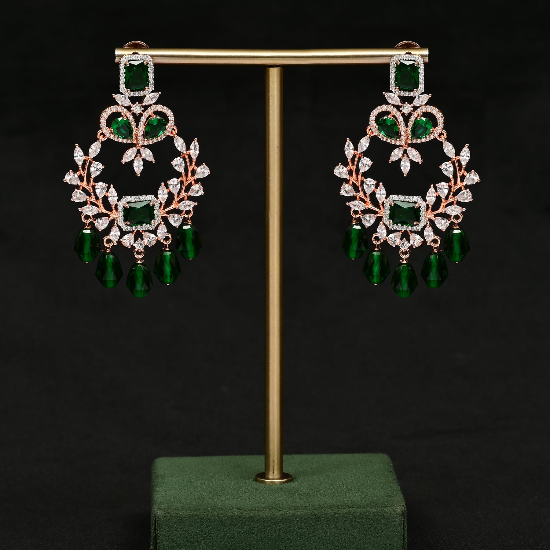 These CZ rose gold earrings feature real cz stones and semi precious ruby stones. Handmade with a real diamond look and an exclusive rose gold finish, these chaandbali earrings are sure to make a statement. Elevate your style and add a touch of luxury with these beautiful and elegant earrings.