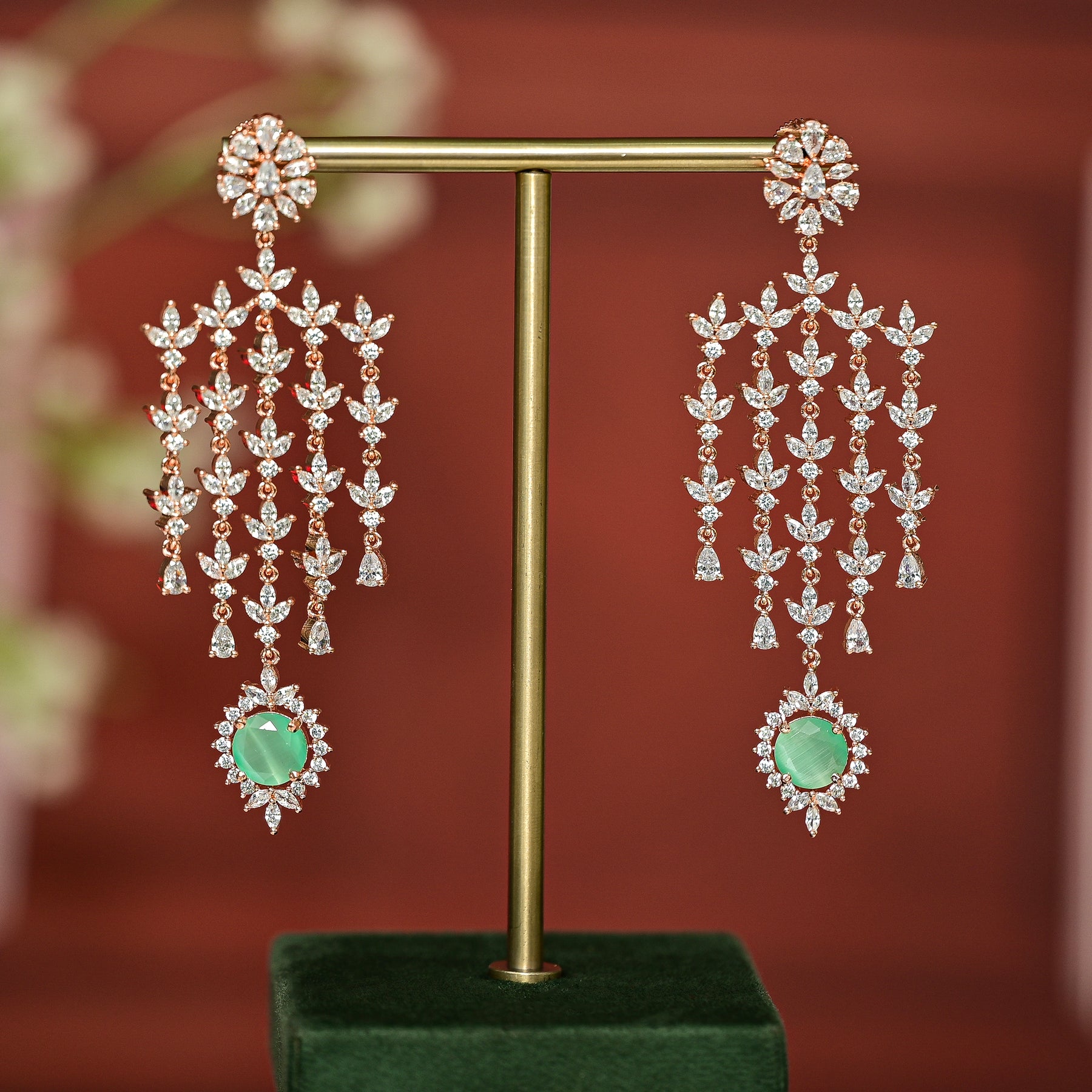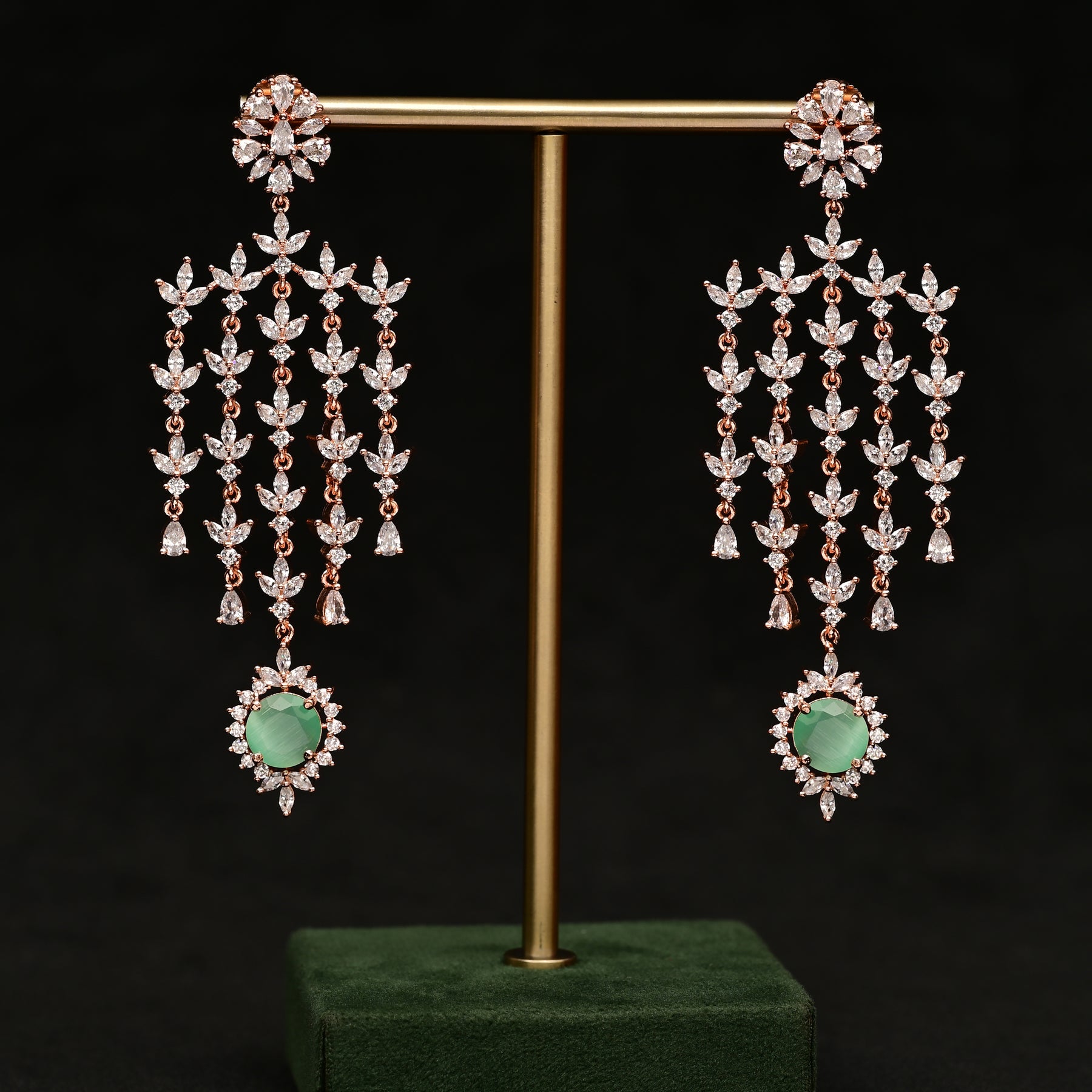 These exclusive handmade CZ rose gold earrings feature real CZ stones and semi-precious mint colored stones for a striking diamond-like look. With their unique design and high-quality materials, these earrings are a must-have for any fashion-forward individual looking to add a touch of luxury to their wardrobe.