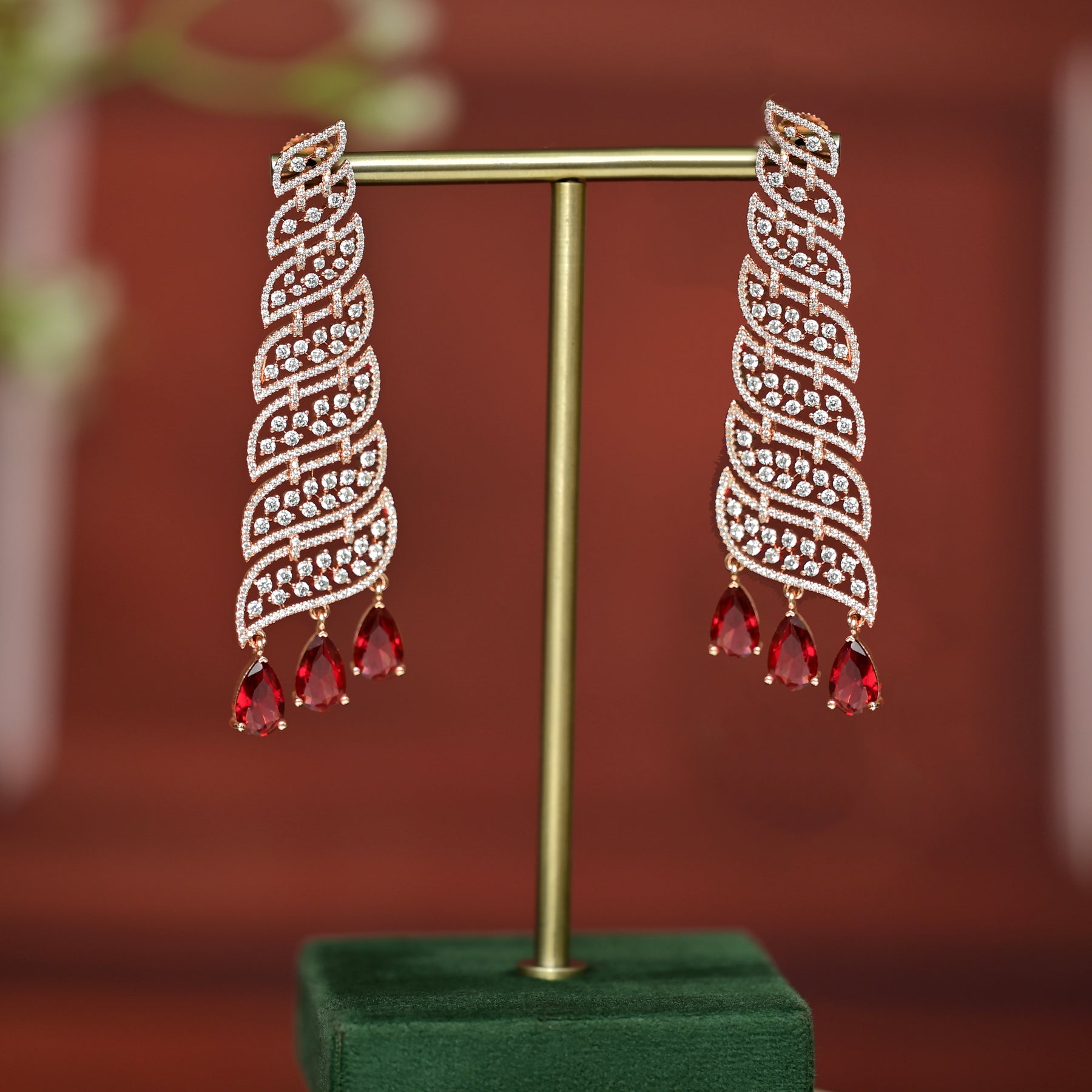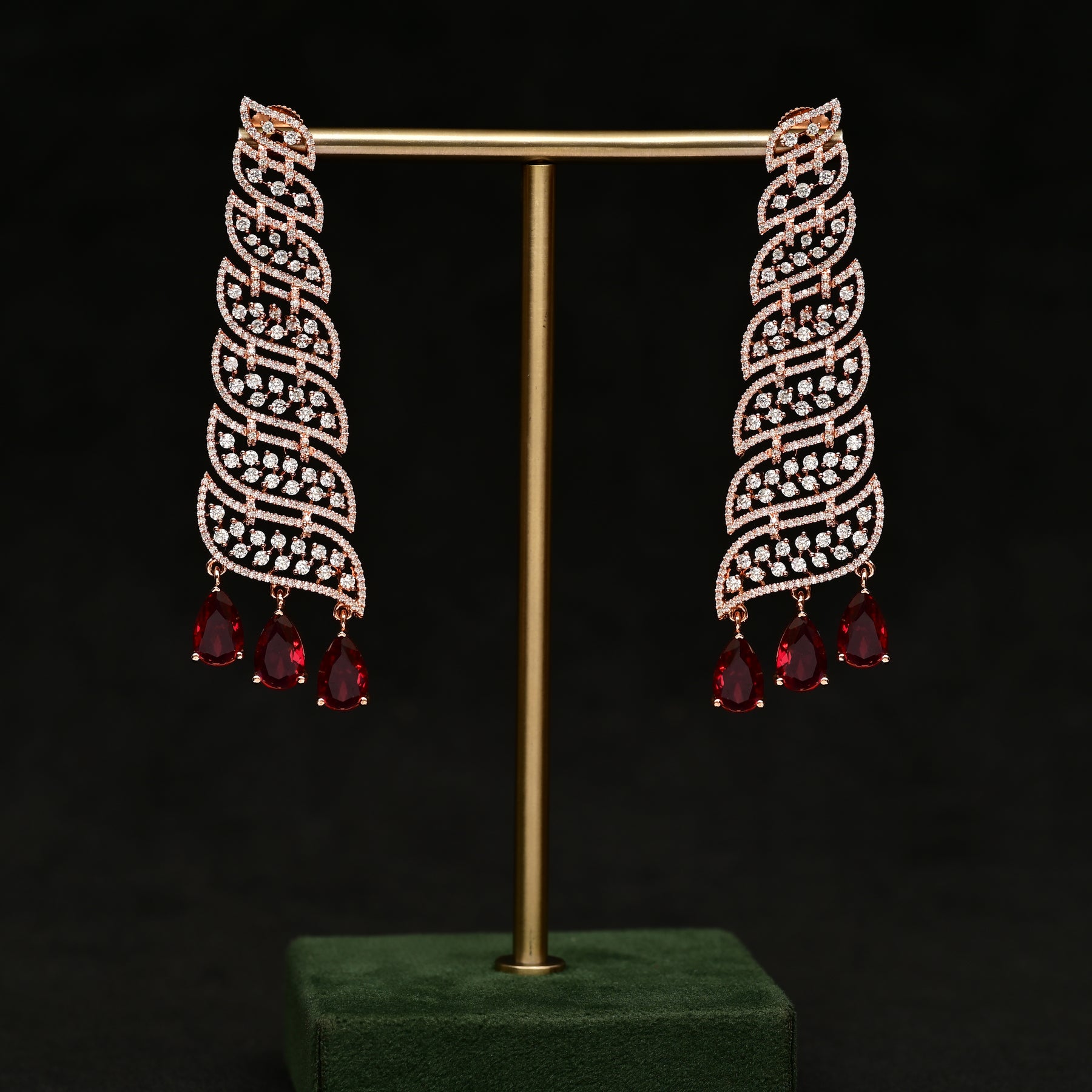 These CZ Rose Gold Earrings feature real cz stones and semi precious ruby stones, intricately handmade with a diamond-like look. The rose gold finish adds a touch of exclusivity to these earrings. Elevate your style with these elegant and timeless pieces.