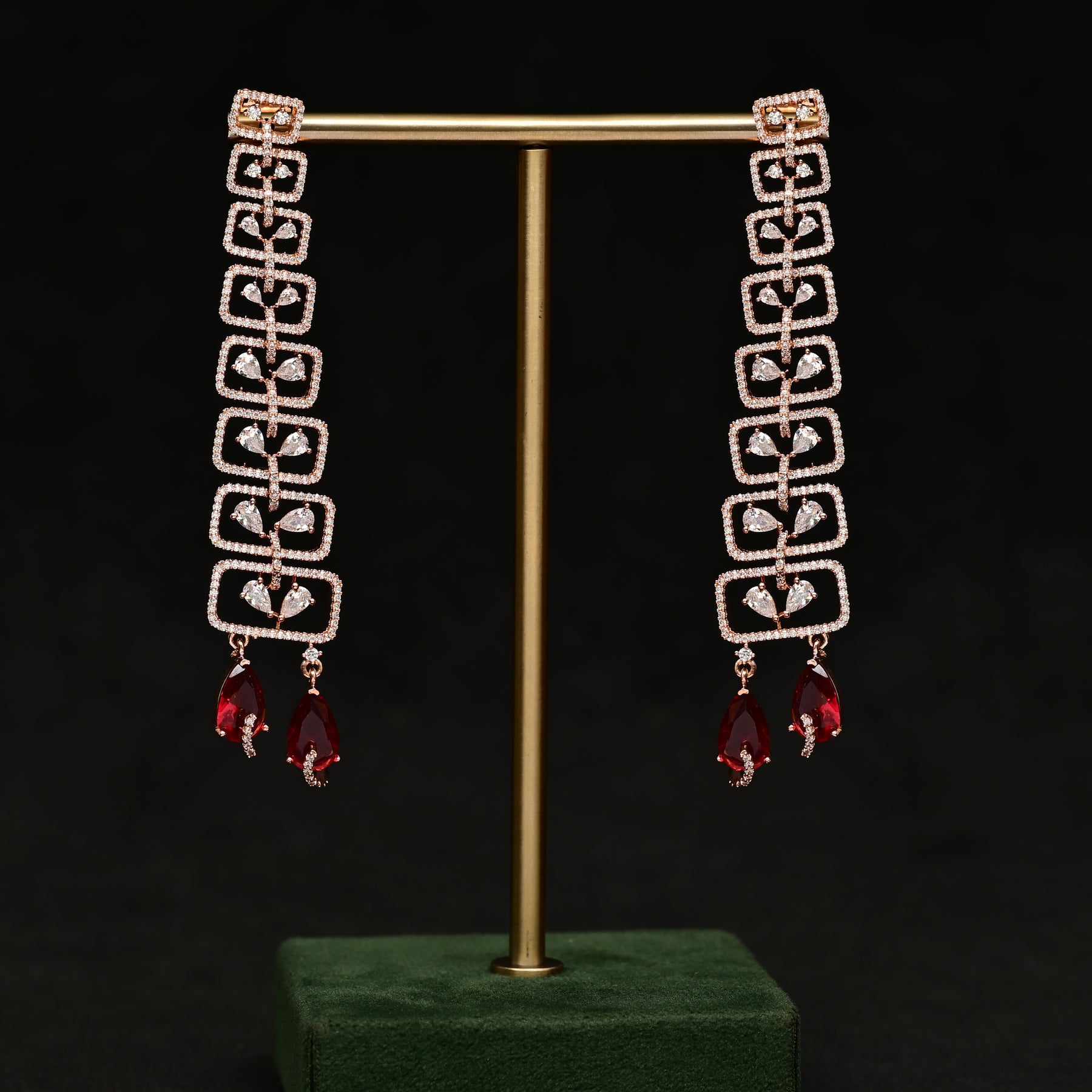 Crafted with real CZ stones and semi-precious ruby stones, these handmade earrings boast an exclusive rose gold finish for a luxurious diamond-like look. Elevate any ensemble with these elegant and timeless accessories.
