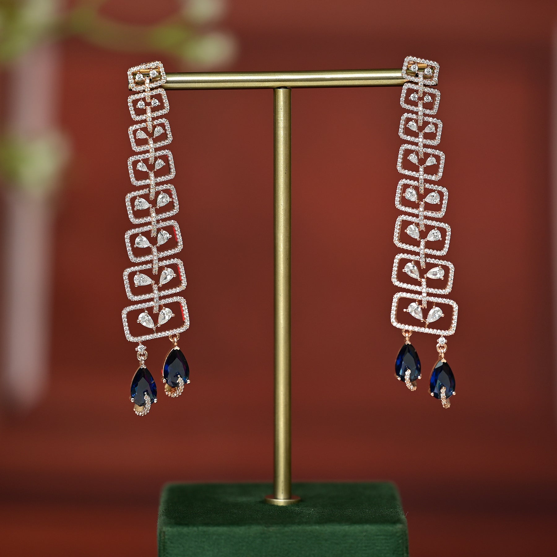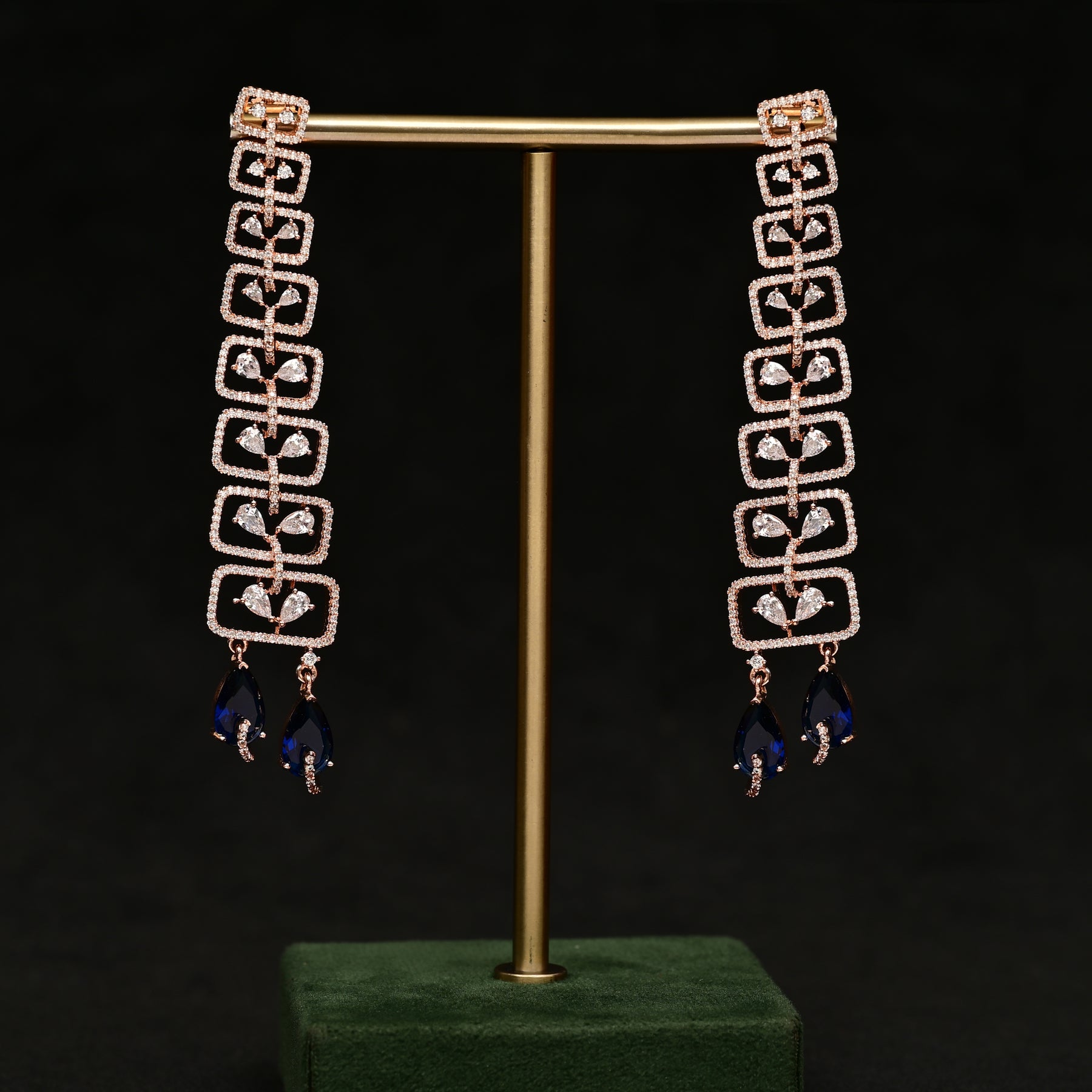 Expertly crafted with genuine CZ stones and semi-precious blue sapphire, these rose gold earrings offer a stunning diamond-like sparkle. Handmade with a unique finish, they add a touch of elegance and sophistication to any outfit. Elevate your style with these exclusive earrings boasting high-quality materials and exquisite design.