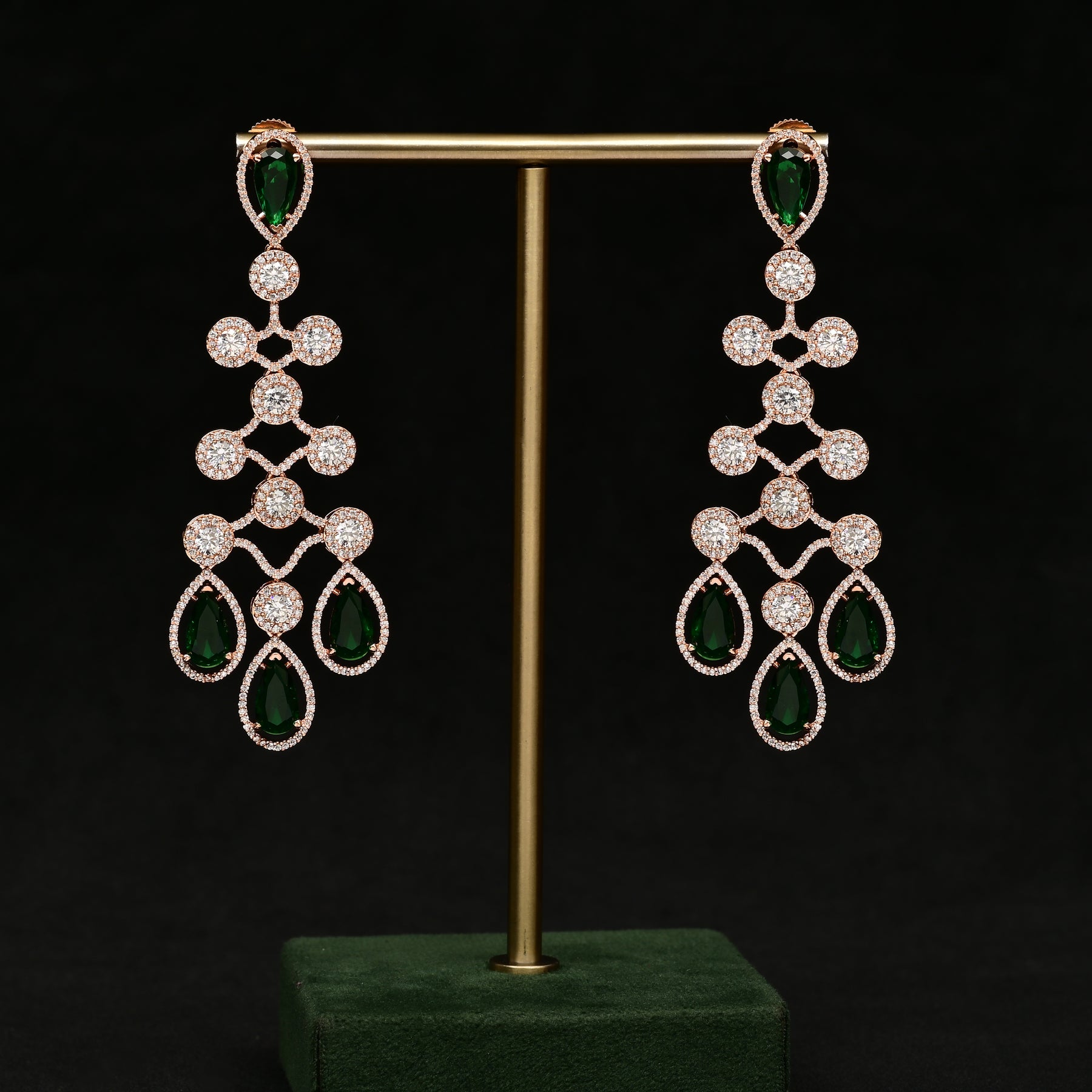 These elegant CZ Rose Gold Earrings feature real CZ stones and semi precious emerald stones, giving them a luxurious look. Handcrafted with an exclusive rose gold finish, they offer the appearance of real diamonds without the high cost. Elevate any outfit with these stunning, one-of-a-kind earrings.