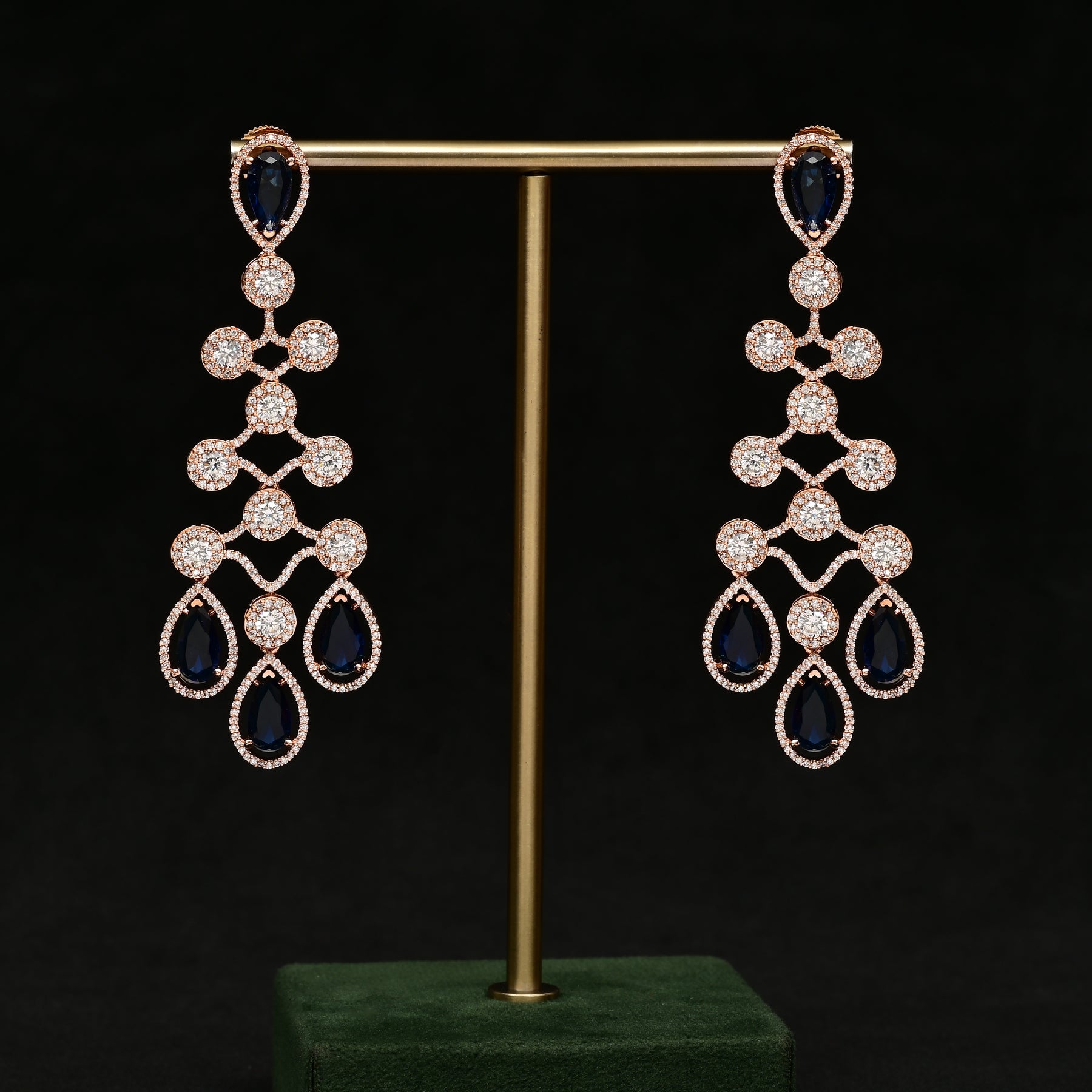 Step up your earring game with these stunning CZ Rose Gold Earrings. Handmade with real CZ and semi-precious blue sapphire stones, their exclusive rose gold finish gives them a dazzling diamond look. Elevate any outfit with these luxurious earrings.