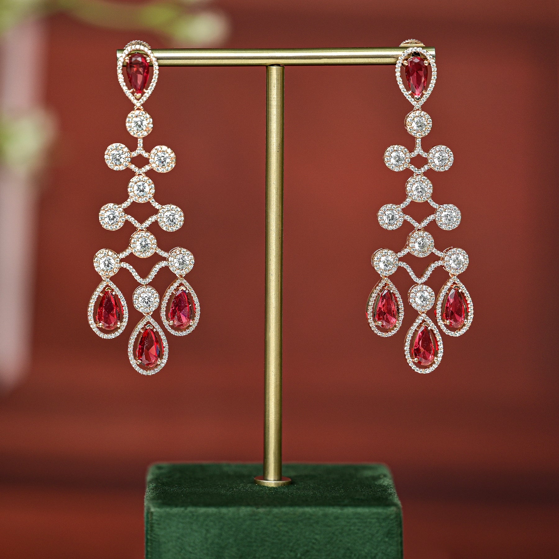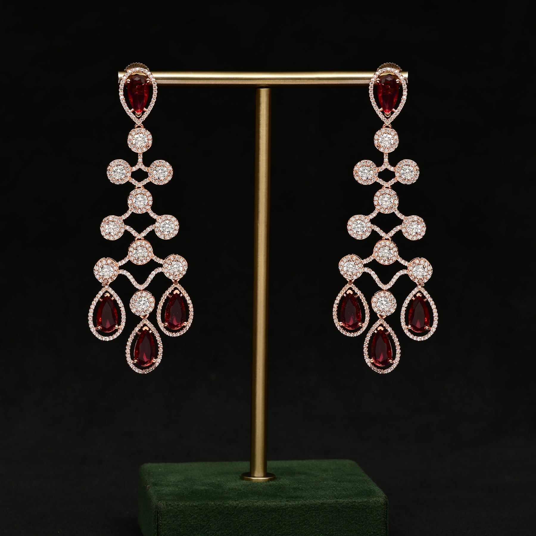 Experience luxury with our CZ Rose Gold Earrings. These handcrafted earrings feature real CZ stones and semi-precious ruby stones for a stunning diamond-like look. The exclusive rose gold finish adds a touch of elegance to any outfit. Indulge in high-quality, sophisticated jewelry with our CZ Rose Gold Earrings.