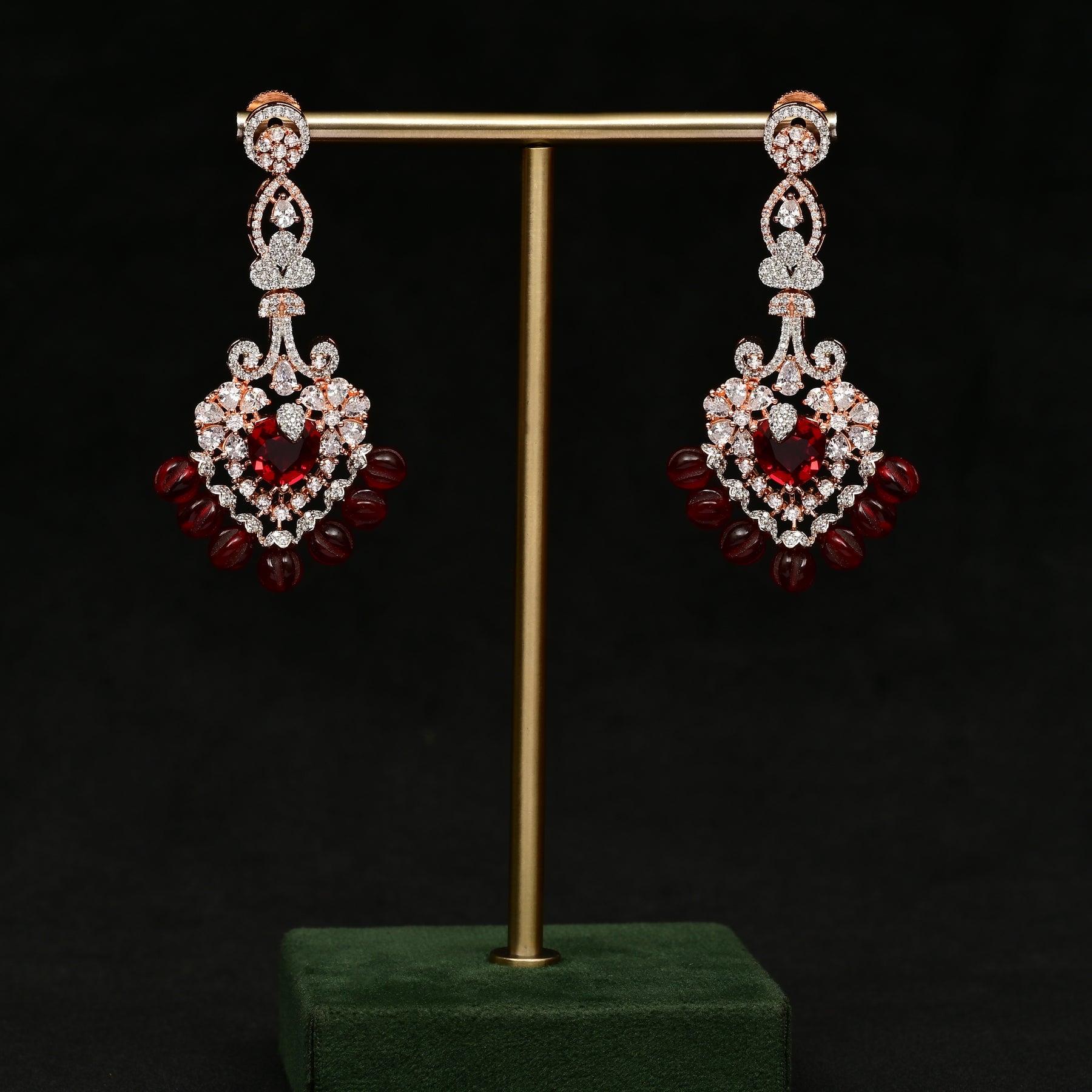 These CZ Rose Gold Earrings offer a stunning combination of real CZ and semi precious ruby stones. Handmade with an exclusive rose gold finish, these earrings provide a luxurious and diamond-like appearance. Elevate any look with these elegant and sophisticated earrings.
