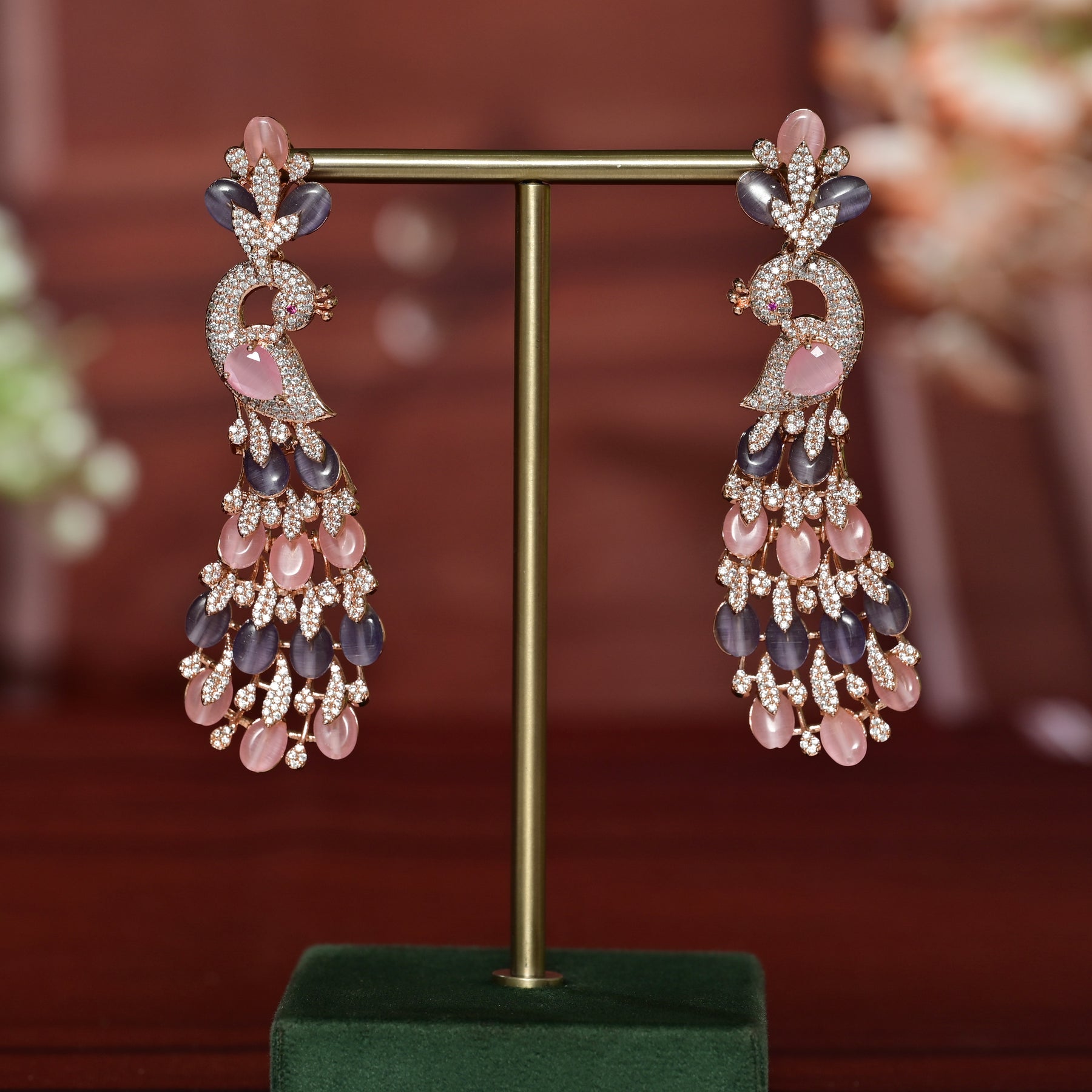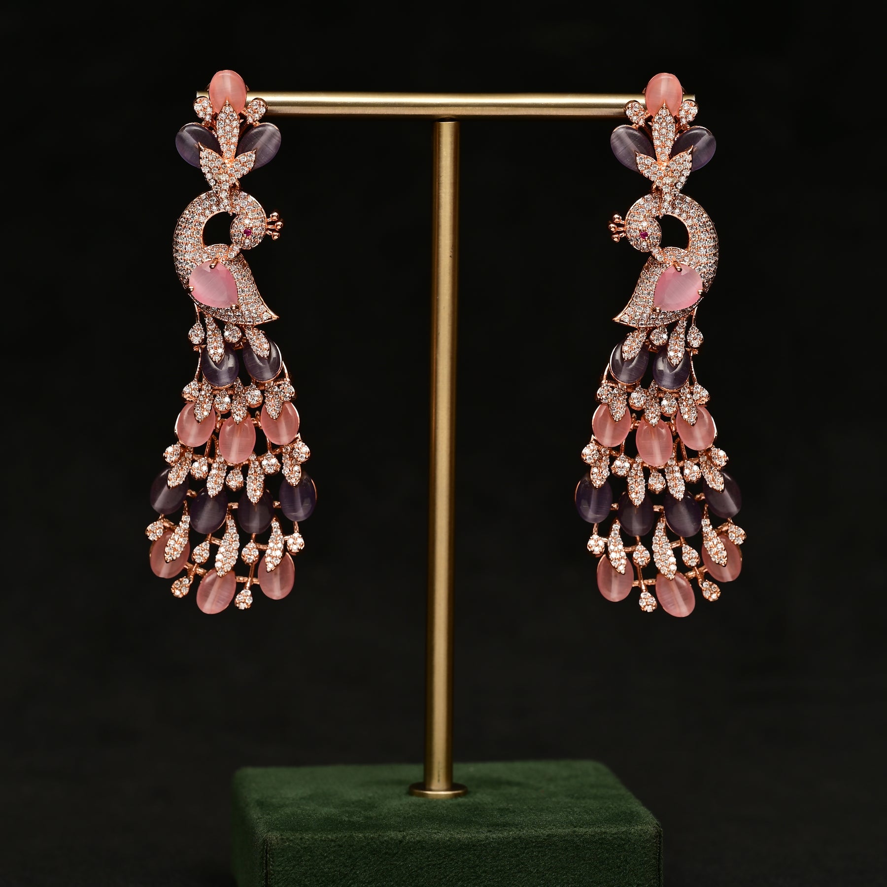 These CZ rose gold earrings feature real CZ stones and semi-precious multicolor stones, creating a stunning, handmade diamond look. Their exclusive peacock design adds a touch of elegance. Expertly crafted, these earrings are a must-have for any jewelry collection.