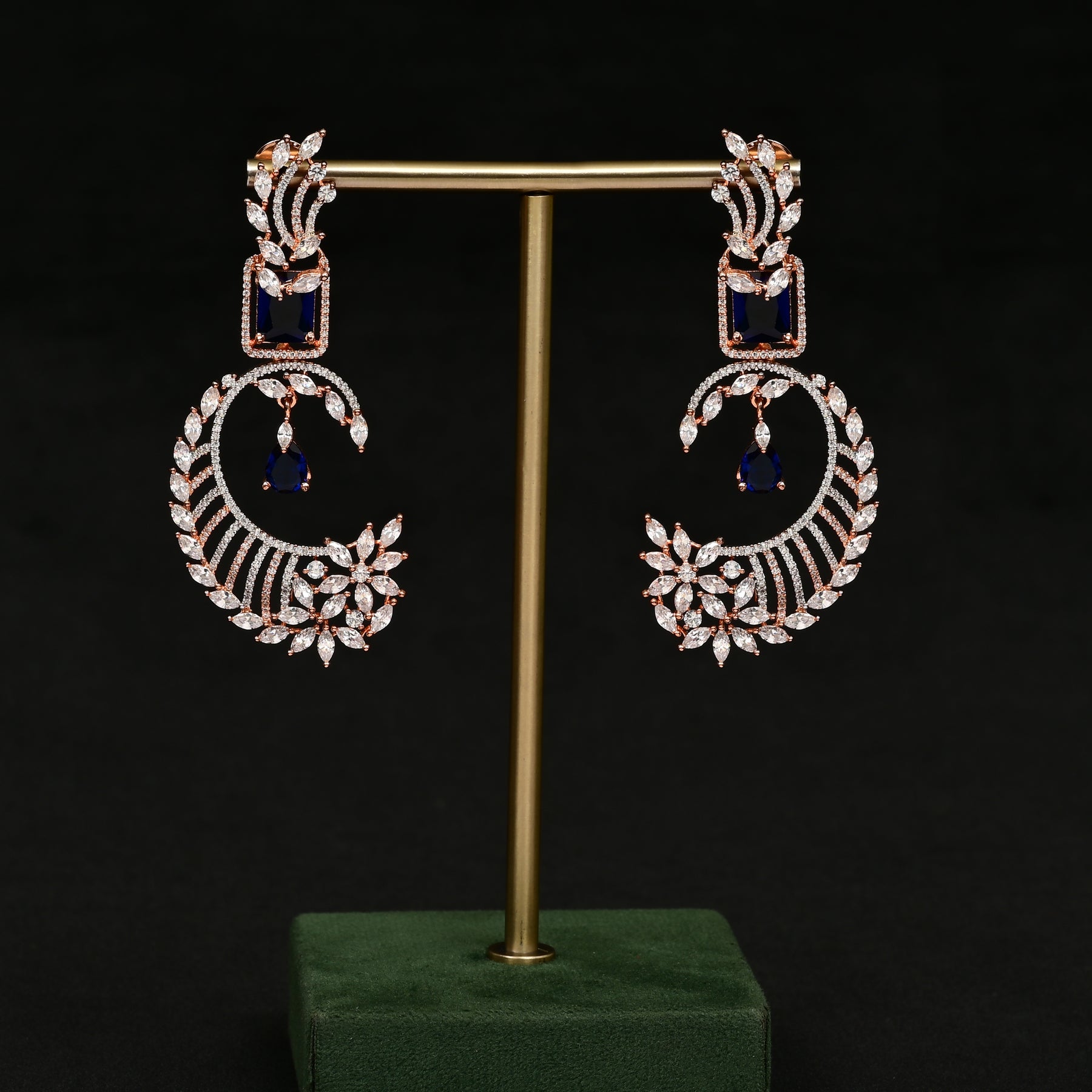 These CZ Rose Gold Earrings are truly unique and exquisite. Each earring is skillfully handcrafted with real CZ stones and semi-precious blue sapphire stones, giving them a stunning diamond-like appearance. The exclusive rose gold finish adds a touch of elegance to these one-of-a-kind earrings. Elevate any outfit with these beautiful earrings.