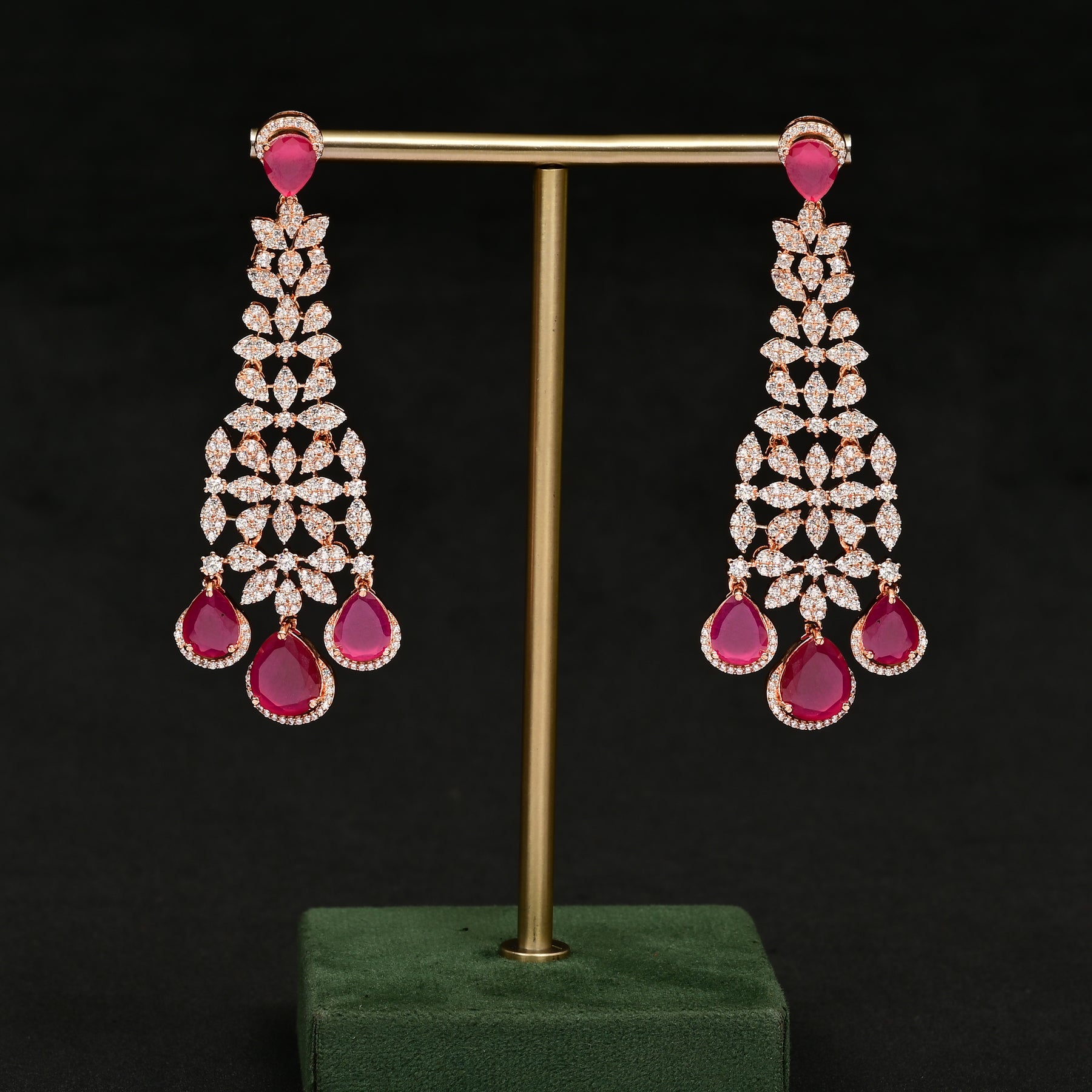 Experience style and elegance with these CZ Rose Gold Earrings. Made with real CZ stones and semi-precious ruby stones, these exclusive handmade earrings give off a stunning diamond appearance. Elevate any outfit with these exquisite earrings.
