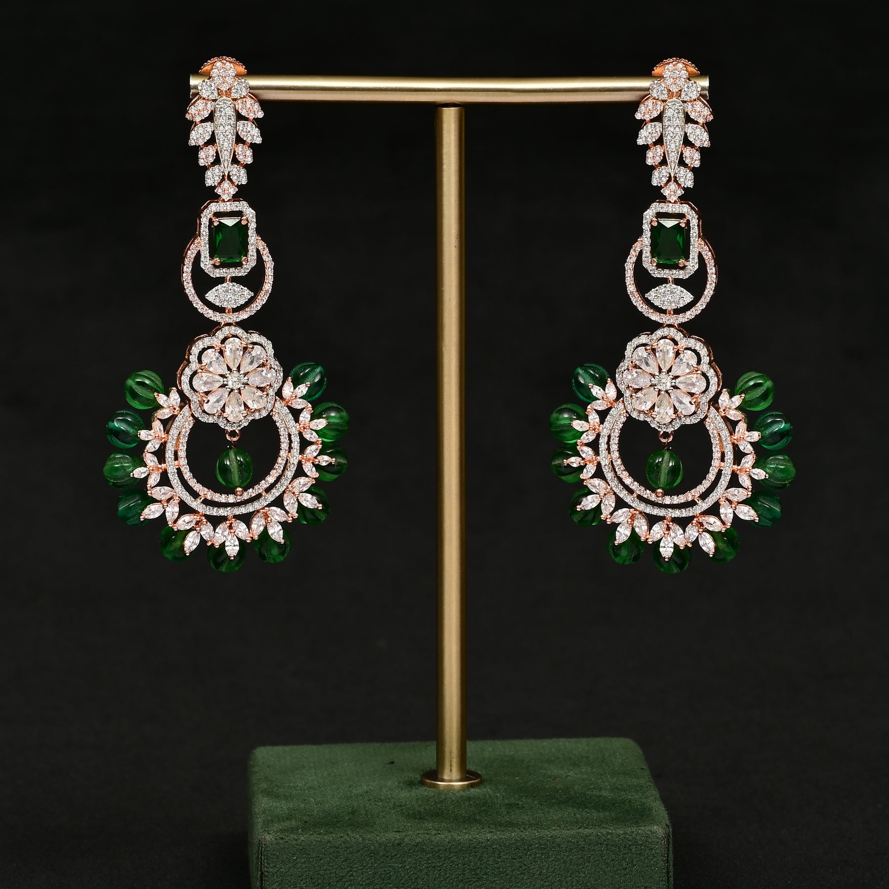 These CZ rose gold earrings feature real semi-precious emerald stones, giving them an exclusive handmade look. The CZ stones provide a real diamond-like shine, making these earrings a stunning addition to any jewelry collection. Experience the luxury and elegance of rose gold with these unique earrings.