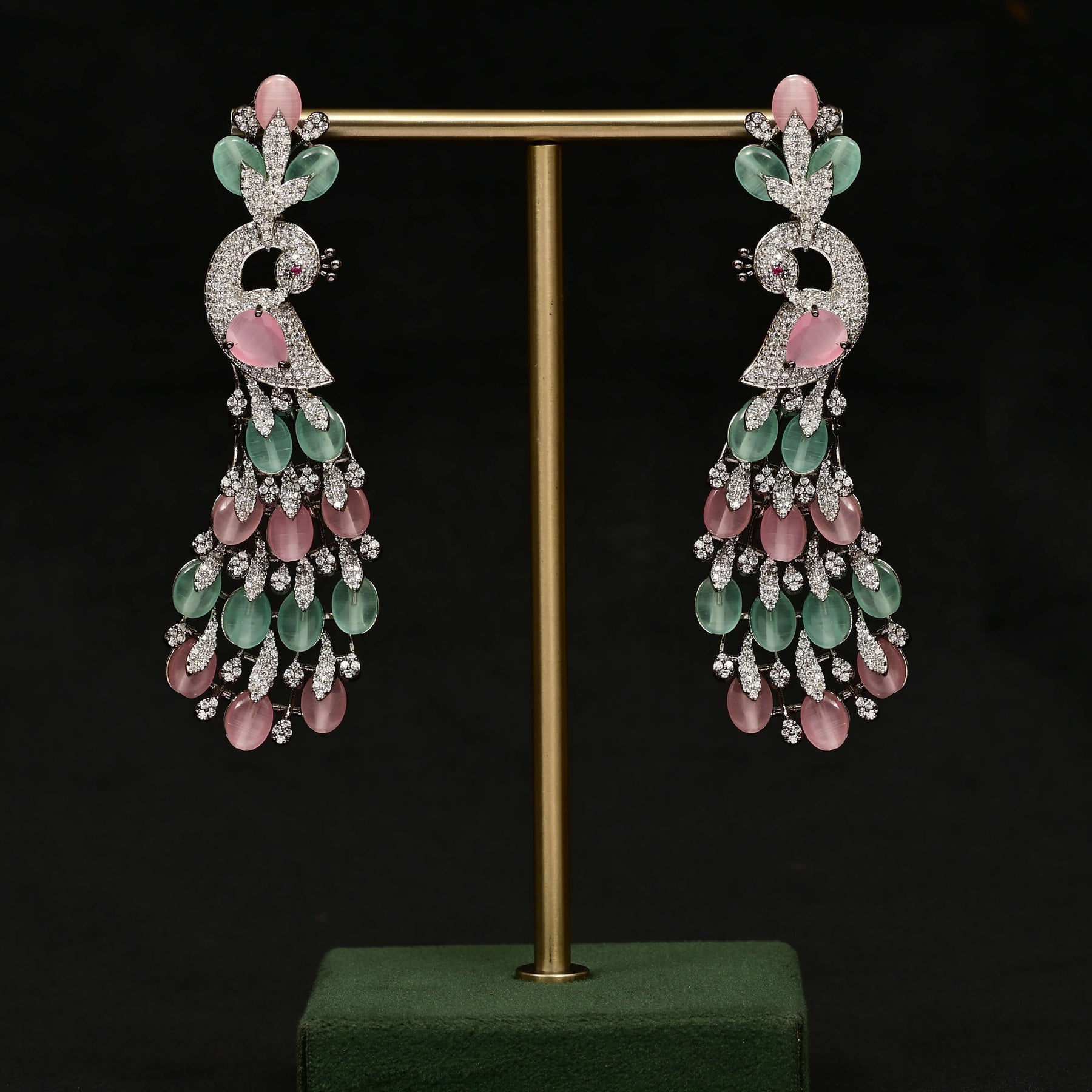 These CZ White Gold Earrings showcase a stunning peacock design, meticulously handcrafted to resemble diamonds. Featuring genuine cubic zirconia stones complemented by semi-precious mint and pink stones, they blend intricate artistry with vibrant color. Finished in elegant white gold, these earrings offer a sophisticated and unique accessory that enhances any ensemble with refined beauty and expert craftsmanship.