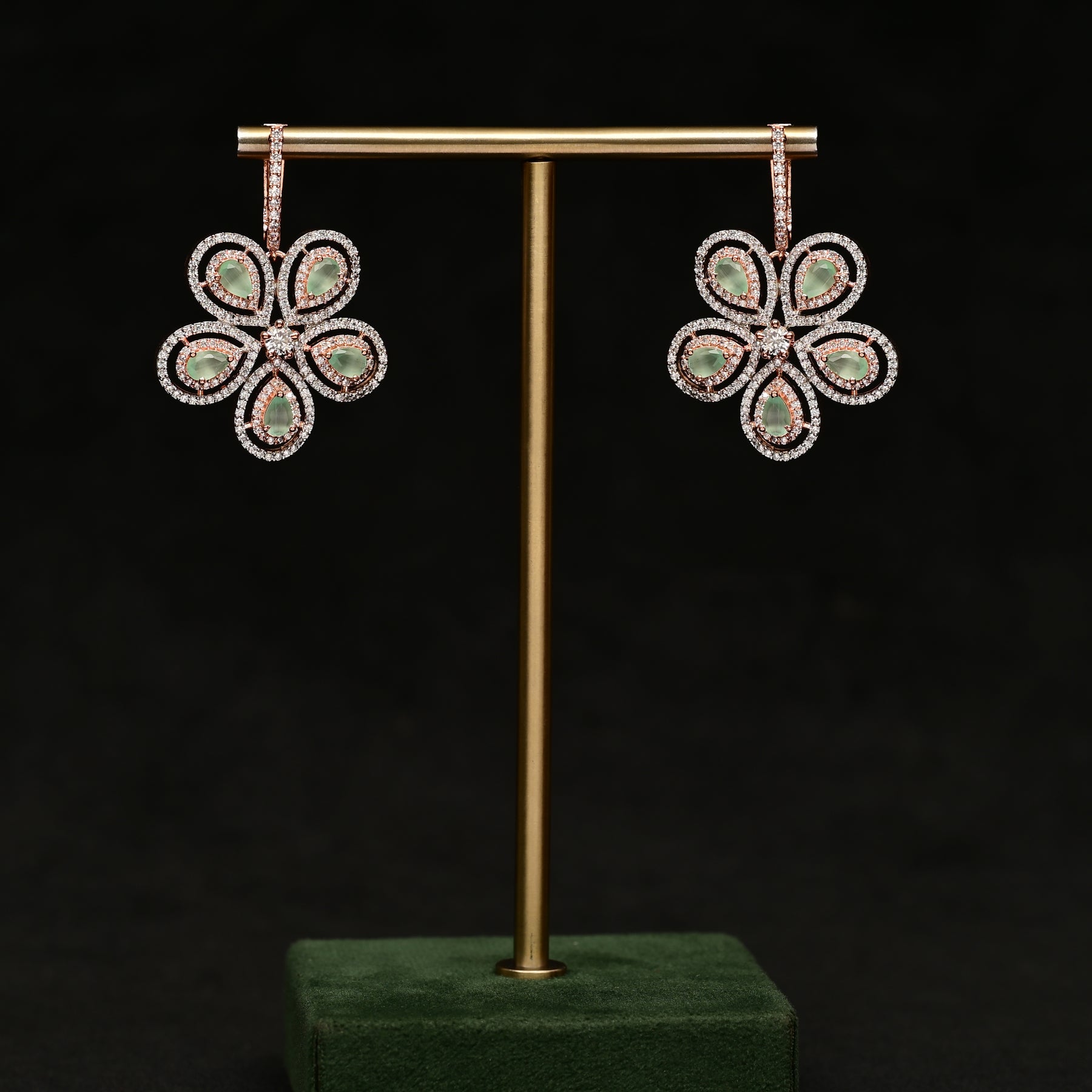 Enhance your style with these handmade Rose Gold Earrings featuring real CZ stones and semi-precious mint color stones. These earrings have a stunning diamond-like look with an exclusive rose gold finish. Elevate any outfit with these elegant, expertly crafted earrings.