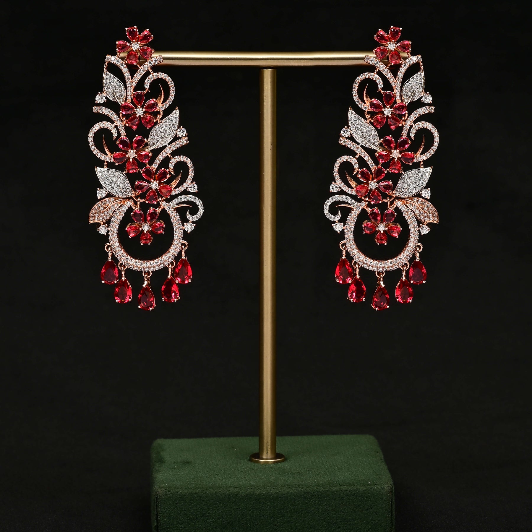 These rose gold-finished earrings feature expertly handcrafted designs that mimic the brilliance of diamonds. Set with genuine cubic zirconia stones, they offer a stunning sparkle and elegant appeal. Perfect for adding a touch of sophistication to any outfit, these earrings combine quality craftsmanship with timeless style.