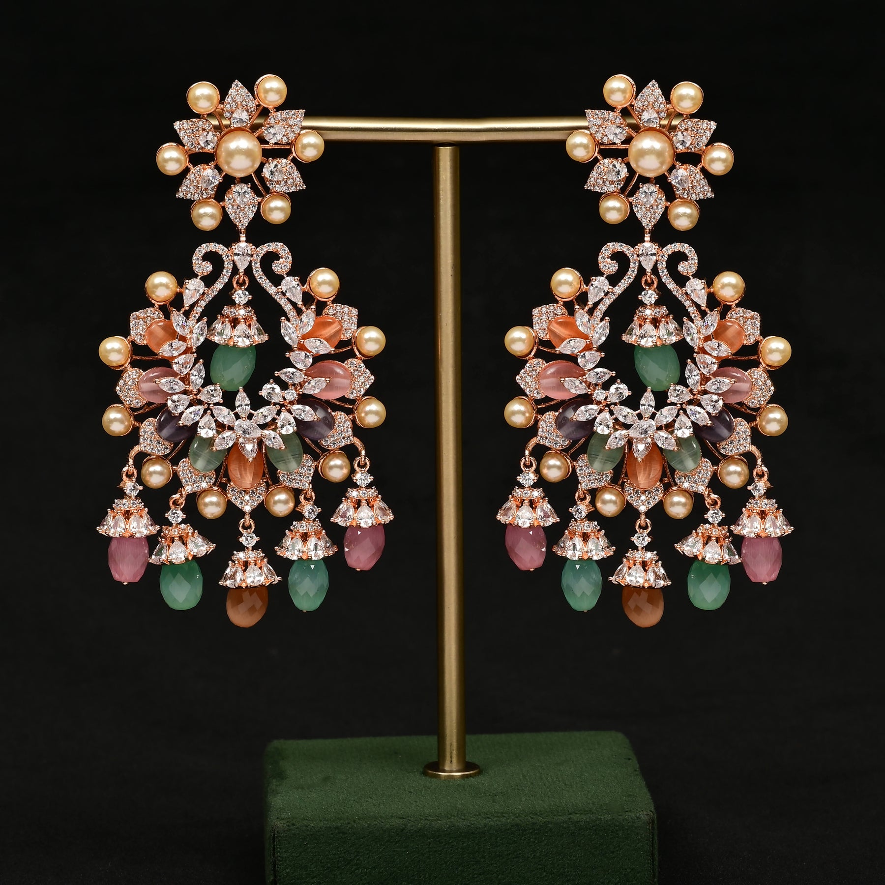These rose gold-finished earrings feature genuine cubic zirconia stones, expertly handcrafted to mimic the brilliance of diamonds. Their elegant design offers a sophisticated sparkle, making them a refined choice for any occasion. Durable and stylish, they combine the allure of fine jewelry with accessible luxury.