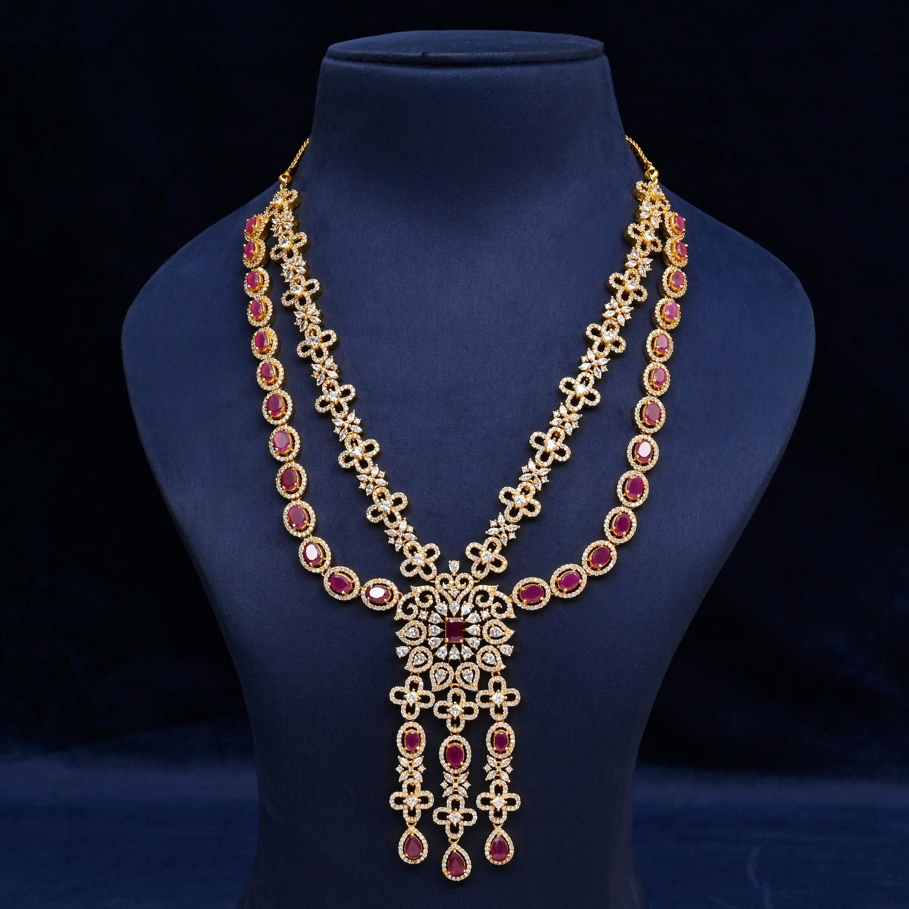 Elevate your collection with this exquisite handcrafted CZ necklace set, featuring authentic cubic zirconia stones paired with semi-precious ruby accents in a lustrous gold finish. Each piece showcases meticulous artisanal craftsmanship, delivering a sophisticated, one-of-a-kind design that captures timeless elegance. The brilliant sparkle of premium CZ stones combined with rich ruby hues creates a striking visual impact, perfect for both special occasions and refined everyday wear. A testament to quality jewelry design that transcends trends.